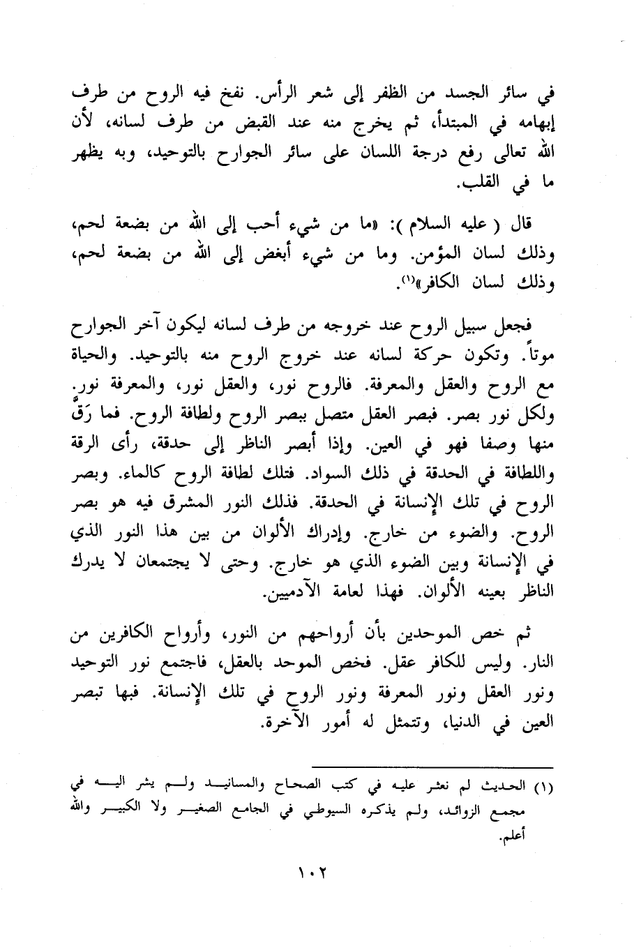 فَجعل سَبِيل الرّوح عِنْد خُرُوجه من طرف لِسَانه ليَكُون آخر الْجَوَارِح موتا وَتَكون حَرَكَة لِسَانه عِنْد خُرُوج الرّوح مِنْهُ بِالتَّوْحِيدِ والحياة مَعَ الرّوح وَالْعقل والمعرفة فالروح نور وَالْعقل نور والمعرفة نور وَلكُل نور بصر فَبَصر الْعقل مُتَّصِل ببصر الرّوح ولطافة الرّوح فَمَا رق مِنْهَا وَصفا فَهُوَ فِي الْعين وَإِذا أبْصر النَّاظر إِلَى حدقة رأى الرقة واللطافة فِي الحدقة فِي ذَلِك السوَاد فَتلك لطافة الرّوح كَالْمَاءِ وبصر الرّوح فِي تِلْكَ الإنسانة فِي الحدقة فَذَلِك النُّور الْمشرق فِيهِ هُوَ بصر الرّوح والضوء من خَارج وَإِدْرَاك الألوان من بَين هَذَا النُّور الَّذِي فِي الإنسانة وَبَين الضَّوْء الَّذِي هُوَ خَارج وَحَتَّى لَا يَجْتَمِعَانِ لَا يدْرك النَّاظر بِعَيْنِه الألوان فَهَذَا لعامة الْآدَمِيّين