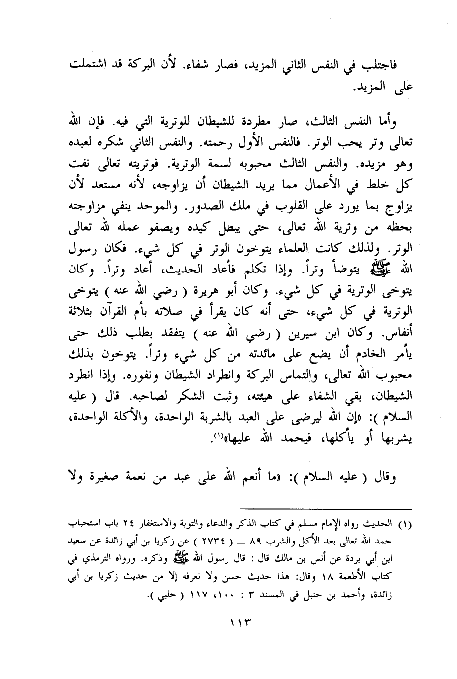 وَأما النَّفس الثَّالِث صَار مطردَة للشَّيْطَان للوترية الَّتِي فِيهِ فَإِن الله تَعَالَى وتر يحب الْوتر فَالنَّفْس الأول رَحمته وَالنَّفس الثَّانِي شكره لعَبْدِهِ وَهُوَ مزيده وَالنَّفس الثَّالِث محبوبه لسمة الوترية فوتريته تَعَالَى نفت كل خلط فِي الْأَعْمَال مِمَّا يُرِيد الشَّيْطَان أَن يزاوجه لِأَنَّهُ مستعد لِأَن يزاوج بِمَا يُورد على الْقُلُوب فِي ملك الصُّدُور والموحد يَنْفِي مزاوجته بحظه من وترية الله تَعَالَى حَتَّى يبطل كَيده ويصفو عمله لله تَعَالَى الْوتر وَلذَلِك كَانَت الْعلمَاء يتوخون الْوتر فِي كل شَيْء فَكَانَ رَسُول الله صلى الله عَلَيْهِ وَسلم يتَوَضَّأ وترا وَإِذا تكلم فَأَعَادَ الحَدِيث أعَاد وترا وَكَانَ يتوخى الوترية فِي كل شَيْء وَكَانَ أَبُو هُرَيْرَة رَضِي الله عَنهُ يتوخى الوترية فِي كل شَيْء حَتَّى أَنه كَانَ يقْرَأ فِي صلَاته بِأم الْقُرْآن بِثَلَاثَة أنفاس وَكَانَ ابْن سِيرِين رَضِي الله عَنهُ يتفقد بِطَلَب ذَلِك حَتَّى يَأْمر الْخَادِم أَن يضع على مائدته من كل شَيْء وترا يتوخون بذلك مَحْبُوب الله تَعَالَى والتماس الْبركَة وانطراد الشَّيْطَان ونفوره وَإِذا انطرد الشَّيْطَان بَقِي الشِّفَاء على هَيئته وَثَبت الشُّكْر لصَاحبه قَالَ صلى الله عَلَيْهِ وَسلم (إِن الله ليرضى على العَبْد بالشربة الْوَاحِدَة والأكلة الْوَاحِدَة يشْربهَا أَو يأكلها فيحمد الله عَلَيْهَا)
