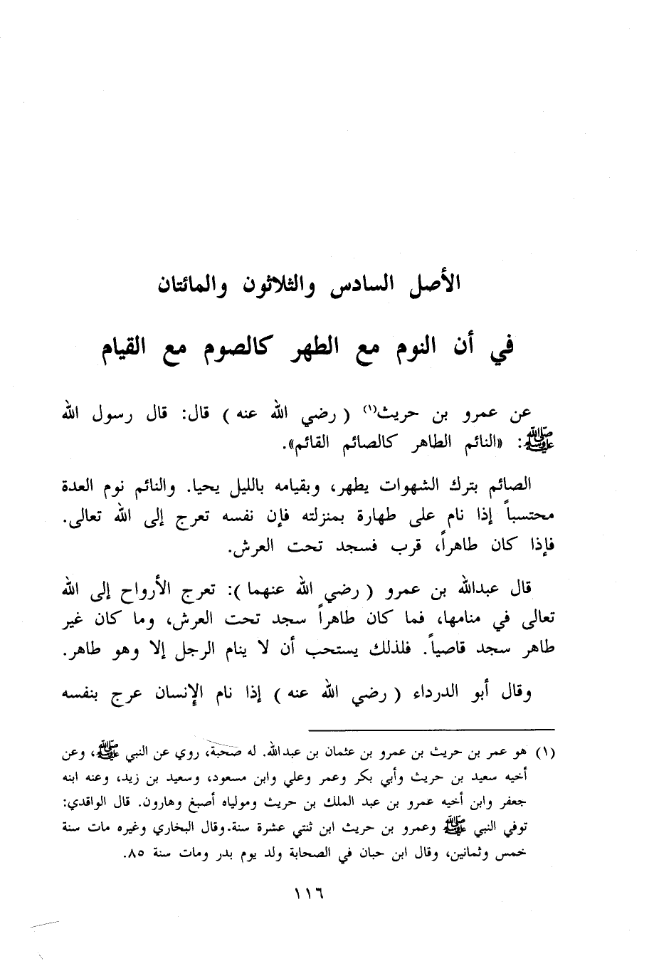عَن عَمْرو بن حُرَيْث رَضِي الله عَنهُ قَالَ قَالَ رَسُول الله صلى الله عَلَيْهِ وَسلم (النَّائِم الطَّاهِر كالصائم الْقَائِم)