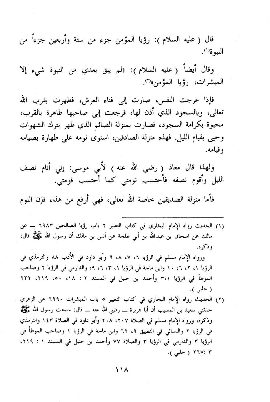فَإِذا عرجت النَّفس صَارَت إِلَى فنَاء الْعَرْش فظهرت بِقرب الله تَعَالَى وبالسجود الَّذِي أذن لَهَا فَرَجَعت إِلَى صَاحبهَا طَاهِرَة بِالْقربِ محبوة بكرامة السُّجُود فَصَارَت بِمَنْزِلَة الصَّائِم الَّذِي طهر بترك الشَّهَوَات وحيى بِقِيَام اللَّيْل فَهَذِهِ منزلَة الصَّادِقين اسْتَوَى نَومه على طَهَارَة بصيامه وقيامه