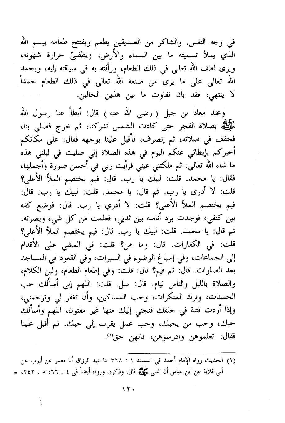 وَعند معَاذ بن جبل رَضِي الله عَنهُ قَالَ أَبْطَأَ عَنَّا رَسُول الله صلى الله عَلَيْهِ وَسلم بِصَلَاة الْفجْر حَتَّى كَادَت الشَّمْس تدركنا ثمَّ خرج فصلى بِنَا فَخفف فِي صلَاته ثمَّ انْصَرف فَأقبل علينا بِوَجْهِهِ فَقَالَ على مَكَانكُمْ أخْبركُم بإبطائي عَنْكُم الْيَوْم فِي هَذِه الصَّلَاة إِنِّي صليت فِي لَيْلَتي هَذِه مَا شَاءَ الله تَعَالَى ثمَّ ملكتني عَيْني فَرَأَيْت رَبِّي فِي أحسن صُورَة وأجملها فَقَالَ يَا مُحَمَّد قلت لبيْك يَا رب قَالَ فيمَ يخْتَصم الْمَلأ الْأَعْلَى قلت لَا أَدْرِي يَا رب ثمَّ قَالَ يَا مُحَمَّد قلت لبيْك يَا رب قَالَ فيمَ يخْتَصم الْمَلأ الْأَعْلَى قلت لَا أَدْرِي يَا رب قَالَ فَوضع كَفه بَين كَتِفي فَوجدت برد أنامله بَين ثديي فَعلمت من كل شَيْء وبصرته ثمَّ قَالَ يَا مُحَمَّد قلت لبيْك يَا رب قَالَ فيمَ يخْتَصم الْمَلأ الْأَعْلَى قلت فِي الْكَفَّارَات قَالَ وَمَا هن قلت فِي الْمَشْي على الْأَقْدَام إِلَى الْجَمَاعَات وَفِي إسباغ الْوضُوء فِي السبرات وَفِي الْقعُود فِي الْمَسَاجِد بعد الصَّلَوَات قَالَ ثمَّ فيمَ قَالَ قلت وَفِي إطْعَام الطَّعَام ولين الْكَلَام وَالصَّلَاة بِاللَّيْلِ وَالنَّاس نيام قَالَ سل قلت اللَّهُمَّ إِنِّي أَسأَلك حب الْحَسَنَات وَترك الْمُنْكَرَات وَحب الْمَسَاكِين وَأَن تغْفر لي وترحمني وَإِذا أردْت فتْنَة فِي خلقك فنجني إِلَيْك مِنْهَا غير مفتون اللَّهُمَّ وَأَسْأَلك حبك وَحب من يحبك وَحب عمل يقرب إِلَى حبك ثمَّ أقبل علينا فَقَالَ تُعَلِّمُوهُنَّ وادرسوهن فَإِنَّهُنَّ حق