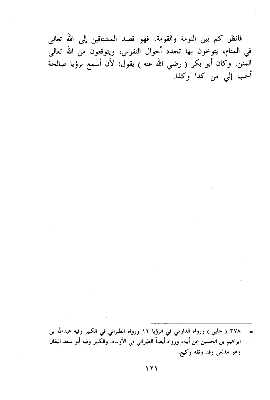 فَانْظُر كم بَين النومة والقومة فَهُوَ قصد المشتاقين إِلَى الله تَعَالَى فِي الْمَنَام يتوخون بهَا تجدّد أَحْوَال النُّفُوس ويتوقعون من الله تَعَالَى المنن وَكَانَ أَبُو بكر رَضِي الله عَنهُ يَقُول لِأَن أسمع برؤيا صَالِحَة أحب إِلَيّ من كَذَا وَكَذَا