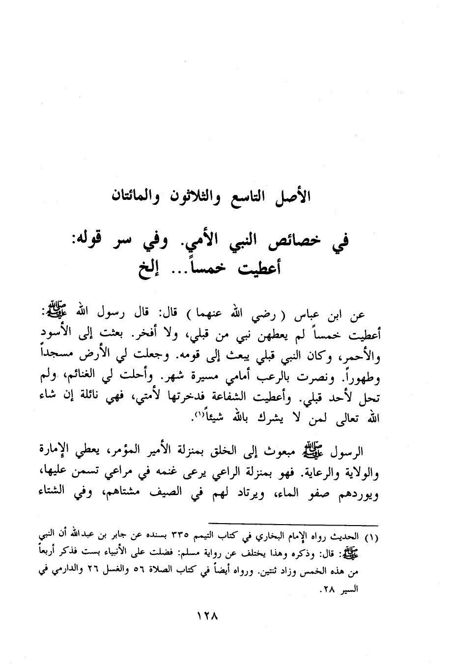 عَن ابْن عَبَّاس رَضِي الله عَنْهُمَا قَالَ قَالَ رَسُول الله صلى الله عَلَيْهِ وَسلم (أَعْطَيْت خمْسا لم يُعْطهنَّ نَبِي من قبلي وَلَا أَفْخَر بعثت إِلَى الْأسود والأحمر وَكَانَ النَّبِي قبلي يبْعَث إِلَى قومه وَجعلت لي الأَرْض مَسْجِدا وَطهُورًا ونصرت بِالرُّعْبِ أَمَامِي مسيرَة شهر وَأحلت لي الْغَنَائِم وَلم تحل لأحد قبلي وَأعْطيت الشَّفَاعَة فدخرتها لأمتي فَهِيَ نائلة إِن شَاءَ الله تَعَالَى لمن لَا يُشْرك بِاللَّه شَيْئا)