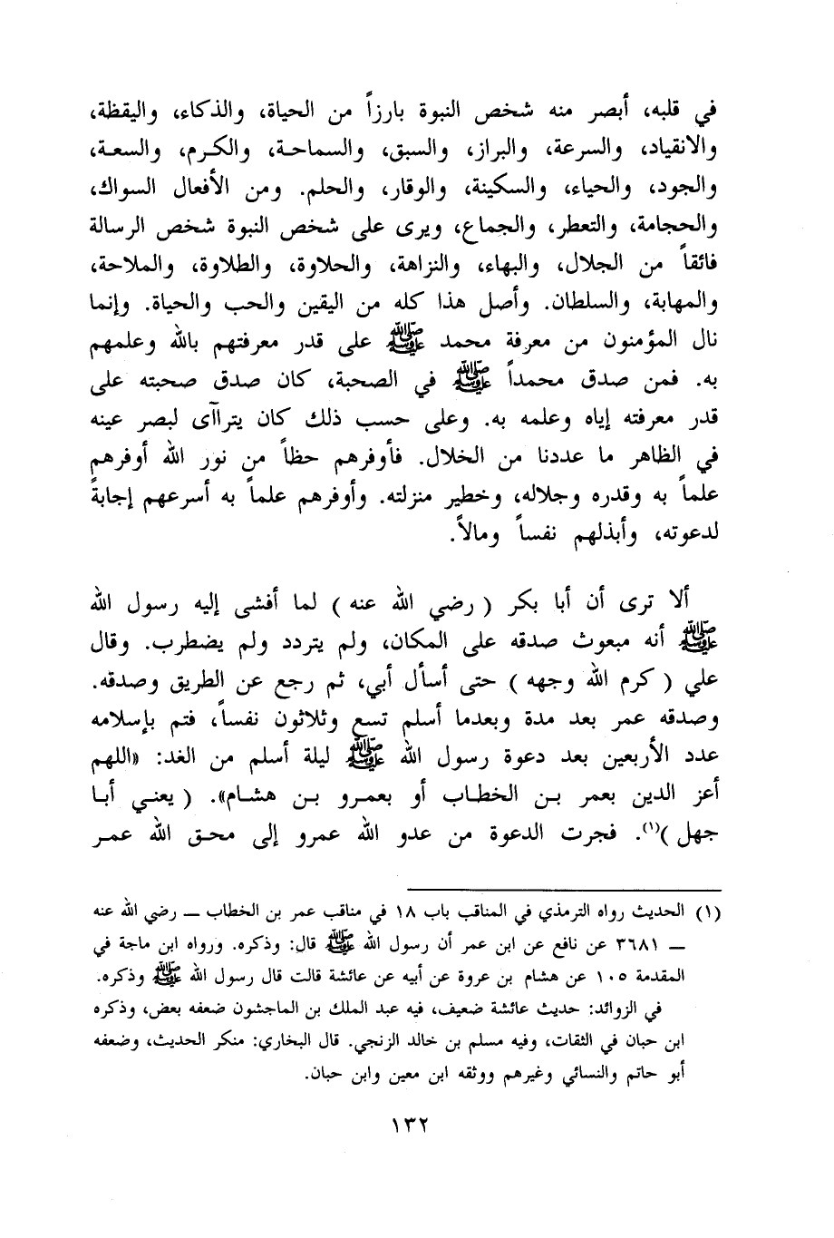 أَلا ترى أَن أَبَا بكر رَضِي الله عَنهُ لما أفشى إِلَيْهِ رَسُول الله صلى الله عَلَيْهِ وَسلم أَنه مَبْعُوث صدقه على الْمَكَان وَلم يتَرَدَّد وَلم يضطرب وَقَالَ عَليّ كرم الله وَجهه حَتَّى أسأَل أبي ثمَّ رَجَعَ عَن الطَّرِيق وَصدقه وَصدقه عمر بعد مُدَّة وَبَعْدَمَا أسلم تسع وَثَلَاثُونَ نفسا فتم بِإِسْلَامِهِ عدد الْأَرْبَعين بعد دَعْوَة رَسُول الله صلى الله عَلَيْهِ وَسلم لَيْلَة أسلم من الْغَد (اللَّهُمَّ أعز الدّين بعمر بن الْخطاب أَو بِعَمْرو بن هِشَام) يَعْنِي أَبَا جهل فجرت الدعْوَة من عَدو الله عَمْرو إِلَى محق الله عمر