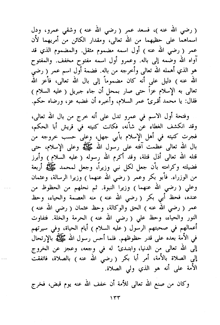 وفتحة أول الِاسْم فِي عَمْرو تدل على أَنه خرج من بَال الله تَعَالَى وَقد انْكَشَفَ الغطاء عَن شَأْنه فَكَانَت كنيته فِي قُرَيْش أَبَا الحكم فجرت كنيته فِي أهل الْإِسْلَام بِأبي جهل وعَلى حسب خُرُوجه من بَال الله تَعَالَى عظمت آفته على رَسُول الله صلى الله عَلَيْهِ وَسلم وعَلى الْإِسْلَام حَتَّى قَتله الله تَعَالَى أذلّ قتلة وَقد أكْرم الله رَسُوله صلى الله عَلَيْهِ وَسلم وأبرز فضيلته وكرامته بِأَن جعل لكل نَبِي وزيرا وَجعل لمُحَمد صلى الله عَلَيْهِ وَسلم أَرْبَعَة من الوزراء فَأَبُو بكر وَعمر رَضِي الله عَنْهُمَا وزيرا الرسَالَة وَعُثْمَان وَعلي رَضِي الله عَنْهُمَا وزيرا النُّبُوَّة ثمَّ نحلهم من الحظوظ من عِنْده فحظ أبي بكر رَضِي الله عَنهُ مِنْهُ الْعِصْمَة وَالْحيَاء وحظ عمر رَضِي الله عَنهُ الْحق وَالْوكَالَة وحظ عُثْمَان رَضِي الله عَنهُ النُّور وَالْحيَاء وحظ عَليّ رَضِي الله عَنهُ الْحُرْمَة والخلة فتفاوت أَعْمَالهم فِي صحبتهم الرَّسُول صلى الله عَلَيْهِ وَسلم أَيَّام الْحَيَاة وَفِي سيرتهم فِي الْأمة بعده على قدر حظوظهم فَلَمَّا أحس رَسُول الله صلى الله عَلَيْهِ وَسلم بالإرتحال إِلَى الله تَعَالَى من الدُّنْيَا وابتدئ لَهُ فِي وَجَعه وَعجز عَن الْخُرُوج إِلَى الصَّلَاة بالأمة أَمر أَبَا بكر رَضِي الله عَنهُ بِالصَّلَاةِ فاتفقت الْأمة على أَنه هُوَ الَّذِي ولي الصَّلَاة