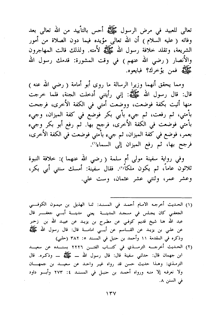 وَمِمَّا يُحَقّق أَنَّهُمَا وزيرا الرسَالَة مَا روى أَبُو أُمَامَة رَضِي الله عَنهُ قَالَ قَالَ رَسُول الله صلى الله عَلَيْهِ وَسلم إِنِّي رَأَيْتنِي أدخلت الْجنَّة فَلَمَّا خرجت مِنْهَا أتيت بكفة فَوضعت وَوضعت أمتِي فِي الكفة الْأُخْرَى فرجحت بأمتي ثمَّ رفعت ثمَّ جِيءَ بِأبي بكر فَوضع فِي كفة الْمِيزَان وَجِيء بأمتي فَوضعت فِي الكفة الْأُخْرَى فرجح بهَا ثمَّ رفع أَبُو بكر وَجِيء بعمر فَوضع فِي كفة الْمِيزَان ثمَّ جِيءَ بأمتي فَوضعت فِي الكفة الْأُخْرَى فرجح بهَا ثمَّ رفع الْمِيزَان إِلَى السَّمَاء