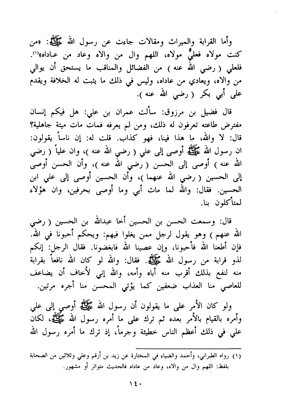 وَأما الْقَرَابَة وَالْمِيرَاث ومقالات جَاءَت عَن رَسُول الله صلى الله عَلَيْهِ وَسلم (من كنت مَوْلَاهُ فعلي مَوْلَاهُ اللَّهُمَّ وَال من وَالَاهُ وَعَاد من عَادَاهُ) فلعلي رَضِي الله عَنهُ من الْفَضَائِل والمناقب مَا يسْتَحق أَن يوالي من وَالَاهُ ويعادي من عَادَاهُ وَلَيْسَ فِي ذَلِك مَا يثبت لَهُ الْخلَافَة وَيقدم على أبي بكر رَضِي الله عَنهُ