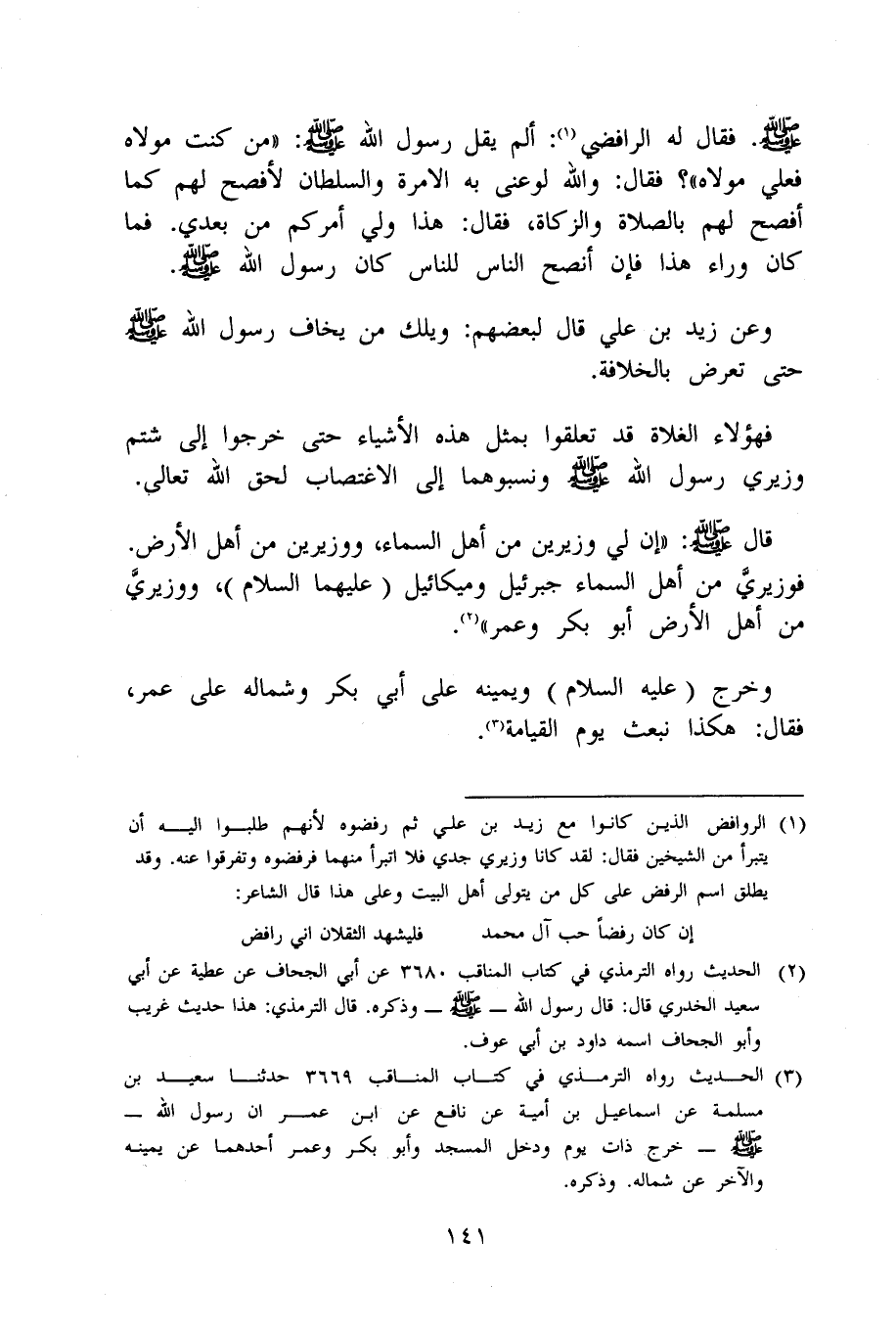 صلى الله عَلَيْهِ وَسلم فَقَالَ لَهُ الرافضي ألم يقل رَسُول الله صلى الله عَلَيْهِ وَسلم (من كنت مَوْلَاهُ) فعلي مَوْلَاهُ فَقَالَ وَالله لَو عَنى بِهِ الامرة وَالسُّلْطَان لأفصح لَهُم كَمَا أفْصح لَهُم بِالصَّلَاةِ وَالزَّكَاة فَقَالَ هَذَا ولي أَمركُم من بعدِي فَمَا كَانَ وَرَاء هَذَا فَإِن أنصح النَّاس للنَّاس كَانَ رَسُول الله صلى الله عَلَيْهِ وَسلم