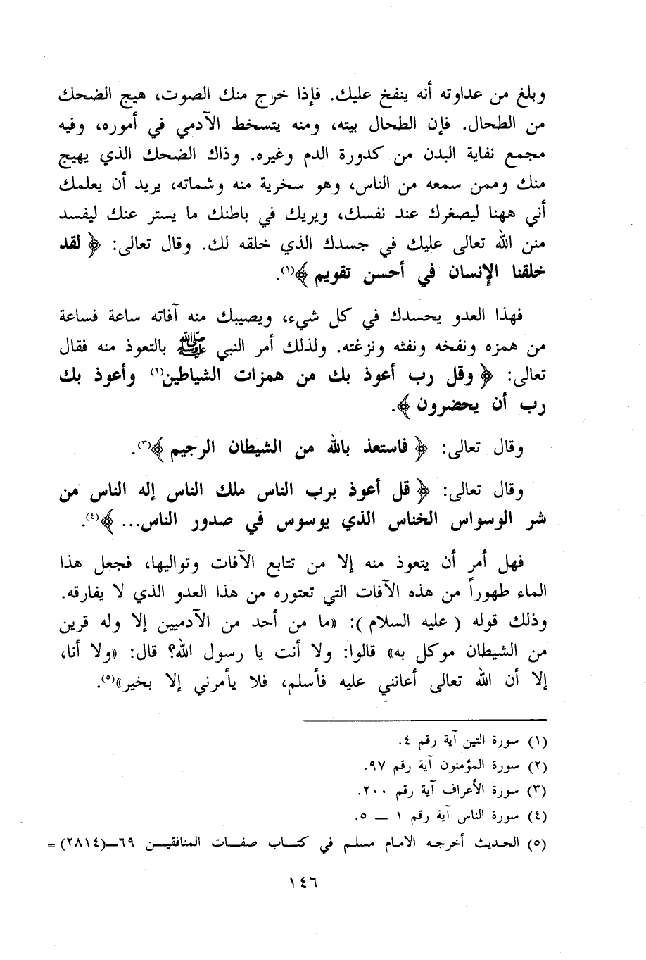 فَهَذَا الْعَدو يحسدك فِي كل شَيْء ويصيبك مِنْهُ آفاته سَاعَة فساعة من همزه ونفخه ونفثه ونزغته وَلذَلِك أَمر النَّبِي صلى الله عَلَيْهِ وَسلم بالتعوذ مِنْهُ فَقَالَ تَعَالَى {وَقل رب أعوذ بك من همزات الشَّيَاطِين وَأَعُوذ بك رب أَن يحْضرُون}
