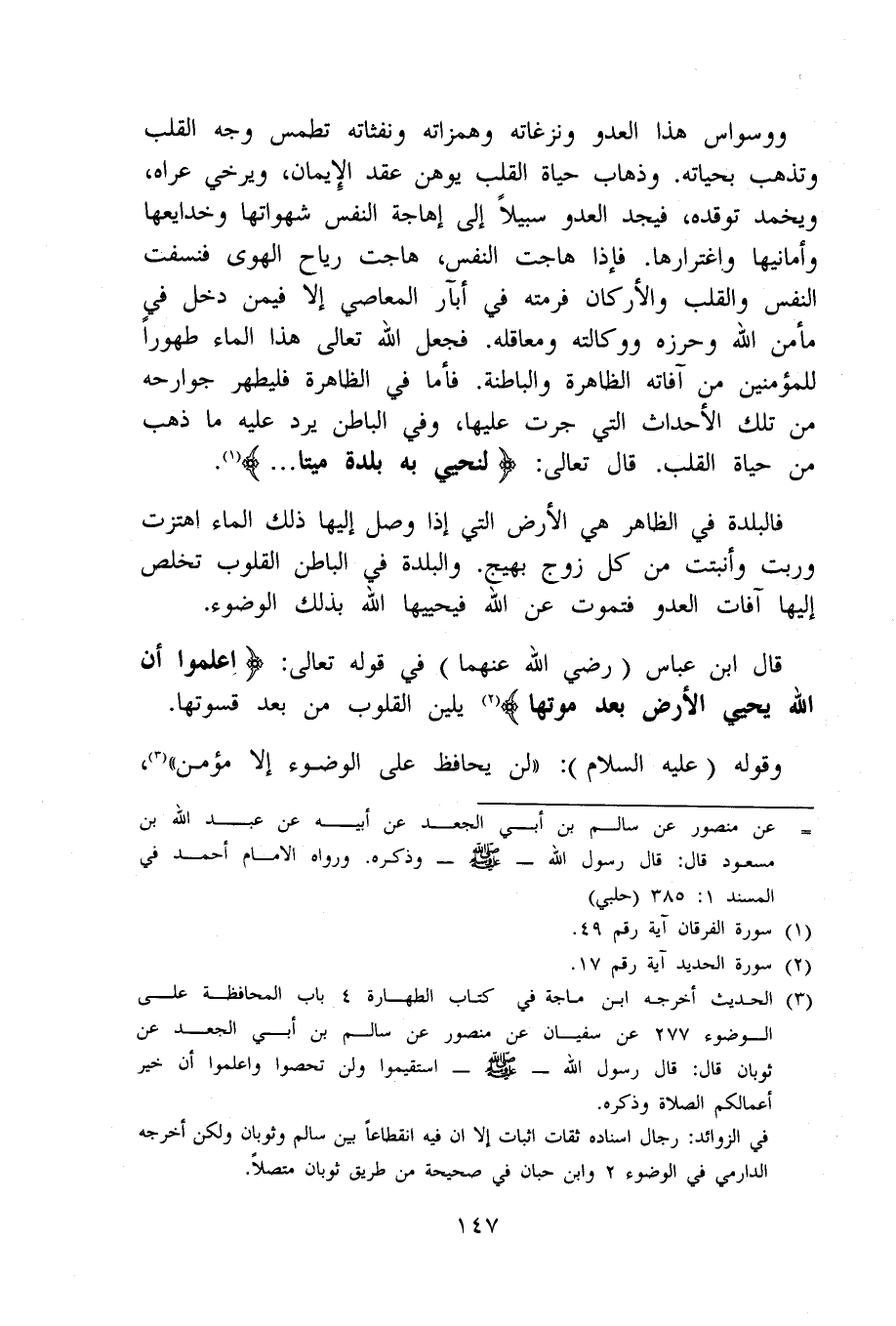 ووسواس هَذَا الْعَدو ونزغاته وهمزاته ونفثاته تطمس وَجه الْقلب وَتذهب بحياته وَذَهَاب حَيَاة الْقلب يوهن عقد الْإِيمَان ويرخي عراه ويخمد توقده فيجد الْعَدو سَبِيلا إِلَى إهاجة النَّفس شهواتها وخدايعها وأمانيها واغترارها فَإِذا هَاجَتْ النَّفس هَاجَتْ ريَاح الْهوى فنسفت النَّفس وَالْقلب والأركان فرمته فِي آبار الْمعاصِي إِلَّا فِيمَن دخل فِي مأمن الله وحرزه ووكالته ومعاقله فَجعل الله تَعَالَى هَذَا المَاء طهُورا للْمُؤْمِنين من آفاته الظَّاهِرَة والباطنة فَأَما فِي الظَّاهِرَة فليطهر جوارحه من تِلْكَ الْأَحْدَاث الَّتِي جرت عَلَيْهَا وَفِي الْبَاطِن يرد عَلَيْهِ مَا ذهب من حَيَاة الْقلب قَالَ تَعَالَى {لنحيي بِهِ بَلْدَة مَيتا}