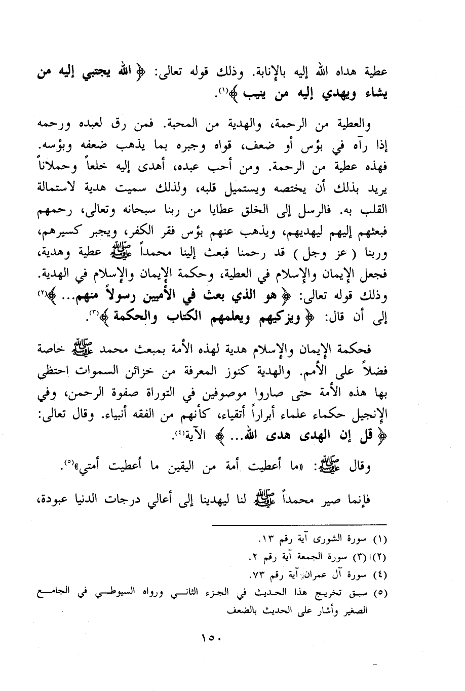 فحكمة الْإِيمَان وَالْإِسْلَام هَدِيَّة لهَذِهِ الْأمة بمبعث مُحَمَّد صلى الله عَلَيْهِ وَسلم خَاصَّة فضلا على الْأُمَم والهدية كنوز الْمعرفَة من خَزَائِن السَّمَوَات احتظى بهَا هَذِه الْأمة حَتَّى صَارُوا موصوفين فِي التَّوْرَاة صفوة الرَّحْمَن وَفِي الْإِنْجِيل حكماء عُلَمَاء أبرارا أتقياء كَأَنَّهُمْ من الْفِقْه أَنْبيَاء وَقَالَ تَعَالَى {قل إِن الْهدى هدى الله} الْآيَة