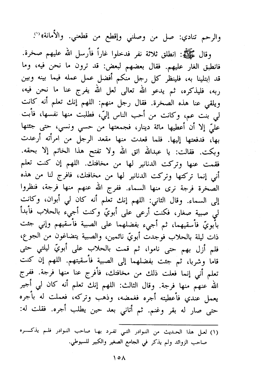 وَقَالَ صلى الله عَلَيْهِ وَسلم انْطلق ثَلَاثَة نفر فَدَخَلُوا غارا فَأرْسل الله عَلَيْهِم صَخْرَة فانطبق الْغَار عَلَيْهِم فَقَالَ بَعضهم لبَعض قد ترَوْنَ مَا نَحن فِيهِ وَمَا قد ابتلينا بِهِ فَلْينْظر كل رجل مِنْكُم أفضل عمل عمله فِيمَا بَينه وَبَين ربه فليذكره ثمَّ يَدْعُو الله تَعَالَى لَعَلَّ الله يفرج عَنَّا مَا نَحن فِيهِ ويلقي عَنَّا هَذِه الصَّخْرَة فَقَالَ رجل مِنْهُم اللَّهُمَّ إِنَّك تعلم أَنه كَانَت لي بنت عَم وَكَانَت من أحب النَّاس إِلَيّ فطلبت مِنْهَا نَفسهَا فَأَبت عَليّ إِلَّا أَن أعطيها مائَة دِينَار فجمعتها من حسي وَنسي حَتَّى جِئْتهَا بهَا فدفعتها إِلَيْهَا فَلَمَّا قعدت مِنْهَا مقْعد الرجل من امْرَأَته أرعدت وبكت فَقَالَت يَا عبد الله اتَّقِ الله وَلَا تفتح هَذَا الْخَاتم إِلَّا بِحقِّهِ فَقُمْت عَنْهَا وَتركت الدَّنَانِير لَهَا من مخافتك اللَّهُمَّ إِن كنت تعلم أَنِّي إِنَّمَا تركتهَا وَتركت الدَّنَانِير لَهَا من مخافتك فافرج لنا من هَذِه الصَّخْرَة فُرْجَة نرى مِنْهَا السَّمَاء فَفرج الله عَنْهُم مِنْهَا فُرْجَة فنظروا إِلَى السَّمَاء وَقَالَ الثَّانِي اللَّهُمَّ إِنَّك تعلم أَنه كَانَ لي أَبَوَانِ وَكَانَت لي صبية صغَار فَكنت أرعى على أَبَوي وَكنت أجيء بالحلاب فأبدأ بأبوي فأسقيهما ثمَّ أجيء بفضلهما على الصبية فأسقيهم وَإِنِّي جِئْت ذَات لَيْلَة بالحلاب فَوجدت أَبَوي نائمين والصبية يتضاغون من الْجُوع فَلم أزل بهم حَتَّى نَامُوا ثمَّ قُمْت بالحلاب على أَبَوي لَيْلَتي حَتَّى قاما وشربا ثمَّ جِئْت بفضلهما إِلَى الصبية فأسقيتهم اللَّهُمَّ إِن كنت تعلم أَنِّي إِنَّمَا فعلت ذَلِك من مخافتك فأفرج عَنَّا مِنْهَا فُرْجَة فَفرج الله عَنْهُم مِنْهَا فُرْجَة وَقَالَ الثَّالِث اللَّهُمَّ إِنَّك تعلم أَنه كَانَ لي أجِير يعْمل عِنْدِي فأعطيته أجره فغمضه وَذهب وَتَركه فَعمِلت لَهُ بأجره حَتَّى صَار لَهُ بقر وغنم ثمَّ أَتَانِي بعد حِين يطْلب أجره فَقلت لَهُ
