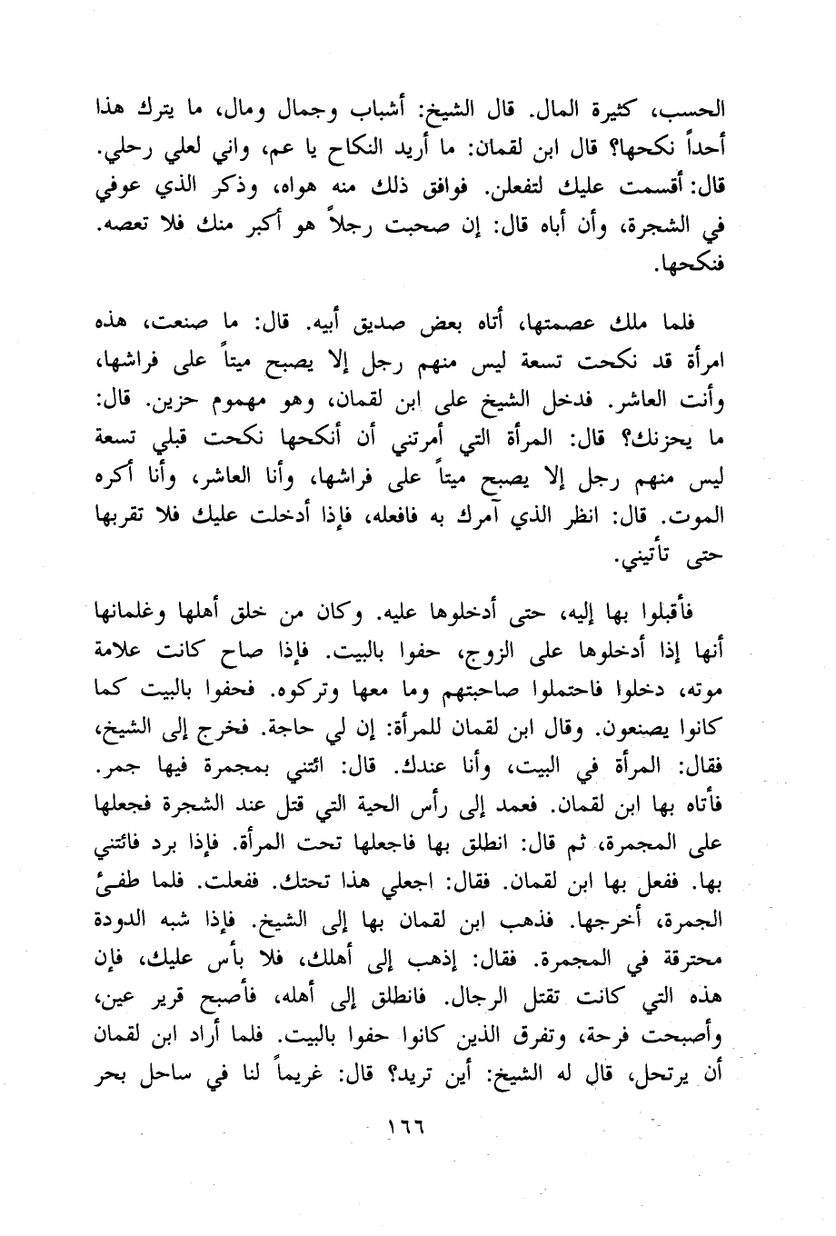 فَأَقْبَلُوا بهَا إِلَيْهِ حَتَّى أدخلوها عَلَيْهِ وَكَانَ من خلق أَهلهَا وغلمانها أَنَّهَا إِذا أدخلوها على الزَّوْج حفوا بِالْبَيْتِ فَإِذا صَاح كَانَت عَلامَة مَوته دخلُوا فاحتملوا صاحبتهم وَمَا مَعهَا وتركوه فحفوا بِالْبَيْتِ كَمَا كَانُوا يصنعون وَقَالَ ابْن لُقْمَان للْمَرْأَة إِن لي حَاجَة فَخرج إِلَى الشَّيْخ فَقَالَ الْمَرْأَة فِي الْبَيْت وَأَنا عنْدك قَالَ ائْتِنِي بمجمرة فِيهَا جمر فَأَتَاهُ بهَا ابْن لُقْمَان فَعمد إِلَى رَأس الْحَيَّة الَّتِي قتل عِنْد الشَّجَرَة فَجَعلهَا على المجمرة ثمَّ قَالَ انْطلق بهَا فاجعلها تَحت الْمَرْأَة فَإِذا برد فائتني بهَا فَفعل بهَا ابْن لُقْمَان فَقَالَ اجعلي هَذَا تَحْتك فَفعلت فَلَمَّا طفئ الْجَمْرَة أخرجهَا فَذهب ابْن لُقْمَان بهَا إِلَى الشَّيْخ فَإِذا شبه الدودة محترقة فِي المجمرة فَقَالَ إذهب إِلَى أهلك فَلَا بَأْس عَلَيْك فَإِن هَذِه الَّتِي كَانَت تقتل الرِّجَال فَانْطَلق إِلَى أَهله فَأصْبح قرير عين وأصبحت فرحة وتفرق الَّذين كَانُوا حفوا بِالْبَيْتِ فَلَمَّا أَرَادَ ابْن لُقْمَان أَن يرتحل قَالَ لَهُ الشَّيْخ أَيْن تُرِيدُ قَالَ غريما لنا فِي سَاحل بَحر