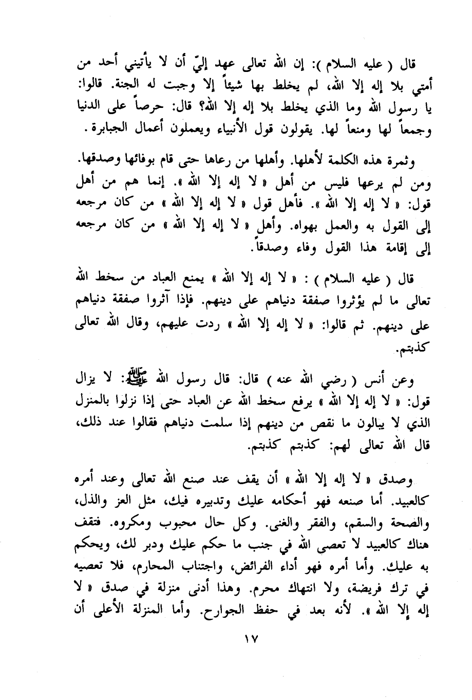 قَالَ عَلَيْهِ السَّلَام (إِن الله تَعَالَى عهد إِلَيّ أَن لَا يأتيني أحد من أمتِي بِلَا إِلَه إِلَّا الله لم يخلط بهَا شَيْئا إِلَّا وَجَبت لَهُ الْجنَّة) قَالُوا يَا رَسُول الله وَمَا الَّذِي يخلط بِلَا إِلَه إِلَّا الله قَالَ (حرصا على الدُّنْيَا وجمعا لَهَا ومنعا لَهَا يَقُولُونَ قَول الْأَنْبِيَاء ويعملون أَعمال الْجَبَابِرَة)