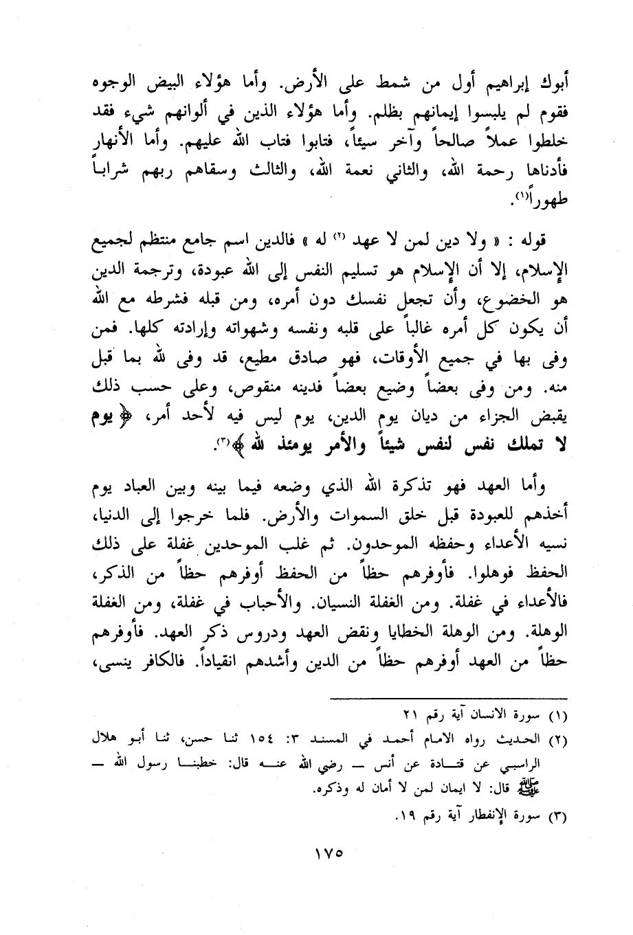 قَوْله وَلَا دين لمن لَا عهد لَهُ فالدين اسْم جَامع مُنْتَظم لجَمِيع الْإِسْلَام إِلَّا أَن الْإِسْلَام هُوَ تَسْلِيم النَّفس إِلَى الله عبودة وترجمة الدّين هُوَ الخضوع وَأَن تجْعَل نَفسك دون أمره وَمن قبله فشرطه مَعَ الله أَن يكون كل أمره غَالِبا على قلبه وَنَفسه وشهواته وإرادته كلهَا فَمن وفى بهَا فِي جَمِيع الْأَوْقَات فَهُوَ صَادِق مُطِيع وَقد وفى لله بِمَا قبل مِنْهُ وَمن وفى بَعْضًا وضيع بَعْضًا فدينه مَنْقُوص وعَلى حسب ذَلِك يقبض الْجَزَاء من ديان يَوْم الدّين يَوْم لَيْسَ فِيهِ لأحد أَمر ليَوْم اتملك نفس لنَفس شَيْئا وَالْأَمر يَوْمئِذٍ لله