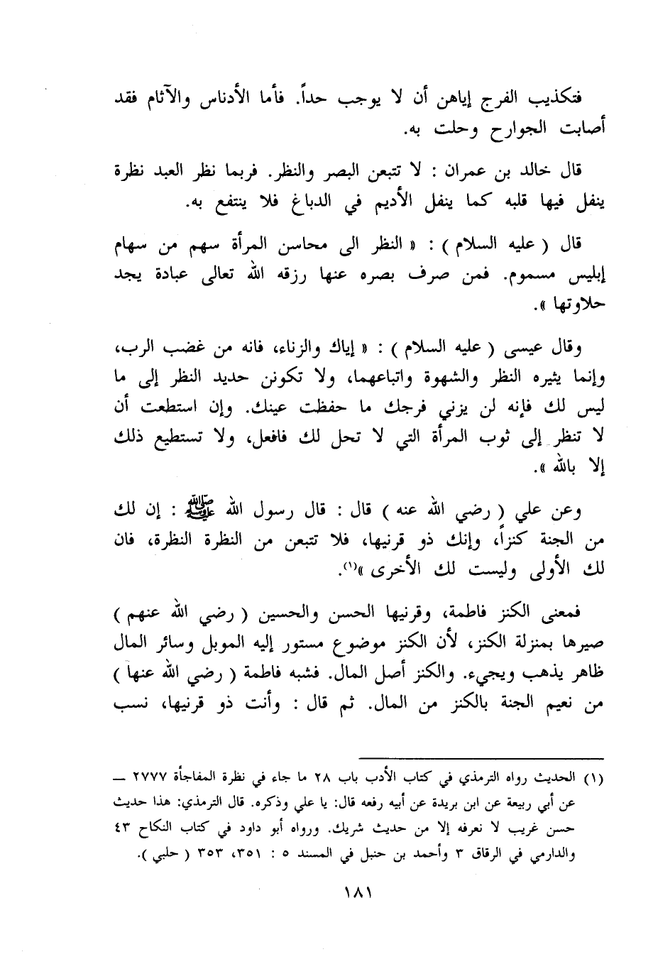 وَعَن عَليّ رَضِي الله عَنهُ قَالَ قَالَ رَسُول الله صلى الله عَلَيْهِ وَسلم (إِن لَك من الْجنَّة كنزا وَإنَّك ذُو قرنيها فَلَا تتبعن من النظرة النظرة فَإِن لَك الأولى وَلَيْسَت لَك الْأُخْرَى)