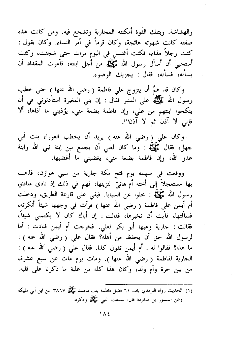 والهشاشة وبتلك الْقُوَّة أمكنته الْمُحَاربَة وتشجع فِيهِ وَمن كَانَت هَذِه صفته كَانَت شَهْوَته هائجة وَكَانَ قرما فِي أَمر النِّسَاء وَكَانَ يَقُول كنت رجلا مذاء فَكنت أَغْتَسِل فِي الْيَوْم مَرَّات حَتَّى شجئت وَكنت أستحيي أَن أسأَل رَسُول الله صلى الله عَلَيْهِ وَسلم من أجل ابْنَته فَأمرت الْمِقْدَاد أَن يسْأَله فَسَأَلَهُ فَقَالَ يجْزِيك الْوضُوء