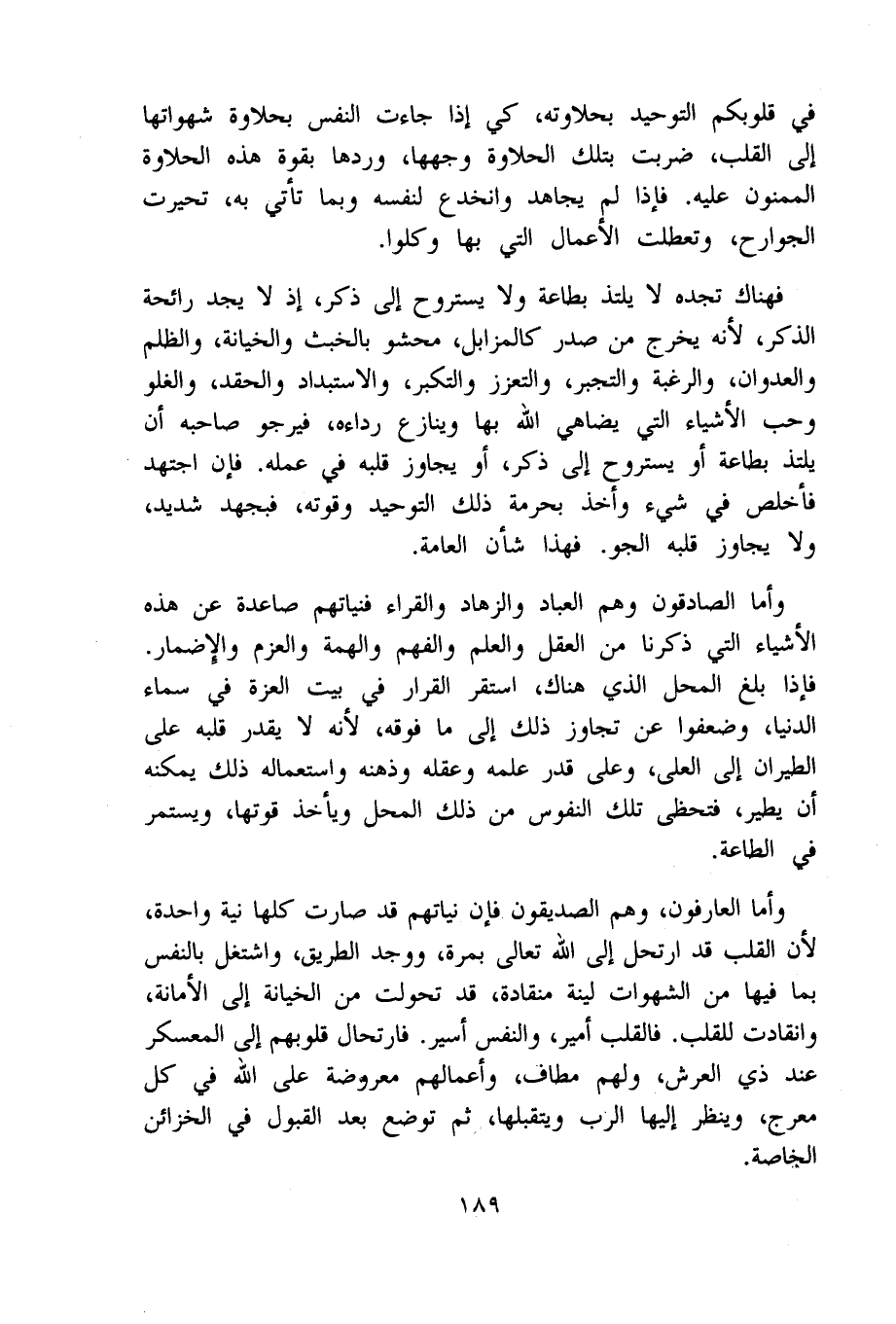 فهناك تَجدهُ لَا يلتذ بِطَاعَة وَلَا يستروح إِلَى ذكر إِذْ لَا يجد رَائِحَة الذّكر لِأَنَّهُ يخرج من صدر كالمزابل محشو بالخبث والخيانة وَالظُّلم والعدوان وَالرَّغْبَة والتجبر والتعزز والتكبر والاستبداد والحقد والغلو وَحب الْأَشْيَاء الَّتِي يضاهي الله بهَا وينازع رِدَاءَهُ فيرجو صَاحبه أَن يلتذ بِطَاعَة أَو يستروح إِلَى ذكر أَو يُجَاوز قلبه فِي عمله فَإِن اجْتهد فأخلص فِي شَيْء وَأخذ بِحرْمَة ذَلِك التَّوْحِيد وقوته فبجهد شَدِيد وَلَا يُجَاوز قلبه الجو فَهَذَا شَأْن الْعَامَّة