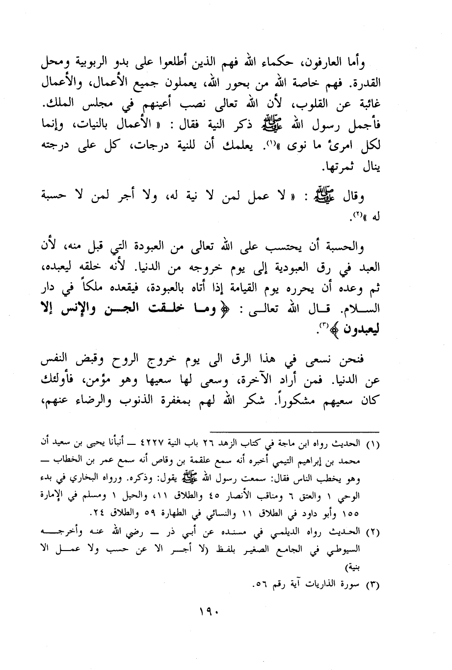 وَأما العارفون حكماء الله فهم الَّذين أطلعوا على بَدو الربوبية وَمحل الْقُدْرَة فهم خَاصَّة الله من بحور الله يعْملُونَ جَمِيع الْأَعْمَال والأعمال غَائِبَة عَن الْقُلُوب لِأَن الله تَعَالَى نصب أَعينهم فِي مجْلِس الْملك فأجمل رَسُول الله صلى الله عَلَيْهِ وَسلم ذكر النِّيَّة فَقَالَ (الْأَعْمَال بِالنِّيَّاتِ وَإِنَّمَا لكل امْرِئ مَا نوى) يعلمك إِن للنِّيَّة دَرَجَات كل على دَرَجَته ينَال ثَمَرَتهَا