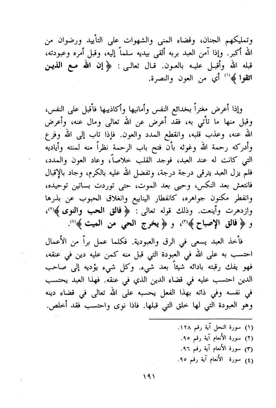 وَإِذا أعرض مغترا بخدائع النَّفس وأمانيها وأكاذيبها فَأقبل على النَّفس وَقبل مِنْهَا مَا تَأتي بِهِ فقد أعرض عَن الله تَعَالَى وَمَال عَنهُ وَأعْرض الله عَنهُ وعذب قلبه وَانْقطع المدد والعون فَإِذا تَابَ إِلَى الله وفزع وأدركه رَحْمَة الله وغوثه بِأَن فتح بَاب الرَّحْمَة نظرا مِنْهُ لمنته وأياديه الَّتِي كَانَت لَهُ عِنْد العَبْد فَوجدَ الْقلب خلاصا وَعَاد العون والمدد فَلم يزل العَبْد يترقى دَرَجَة دَرَجَة وتفضل الله عَلَيْهِ بِالْكَرمِ وجاد بالإقبال فانتعش بعد النكس وحيى بعد الْمَوْت حَتَّى توردت بساتين توحيده وانفطر مَكْنُون جواهره كانفطار الْيَنَابِيع وانغلاق الْحُبُوب عَن بذرها وازدهرت وأينعت وَذَلِكَ قَوْله تَعَالَى {فالق الْحبّ والنوى} و {فالق الإصباح} و {يخرج الْحَيّ من الْمَيِّت}