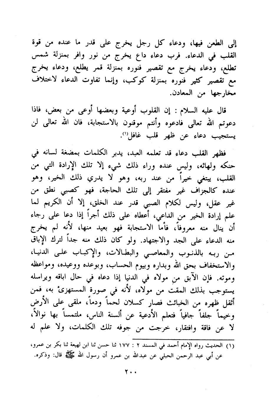 إِلَى الطعْن فِيهَا وَدُعَاء كل رجل يخرج على قدر مَا عِنْده من قُوَّة الْقلب فِي الدُّعَاء فَرب دُعَاء دَاع يخرج من نور وافر بِمَنْزِلَة شمس تطلع وَدُعَاء يخرج مَعَ تَقْصِير فنوره بِمَنْزِلَة قمر يطلع وَدُعَاء يخرج مَعَ تَقْصِير كثير فنوره بِمَنْزِلَة كَوْكَب وَإِنَّمَا تفَاوت الدُّعَاء لاخْتِلَاف مخارجها من الْمَعَادِن