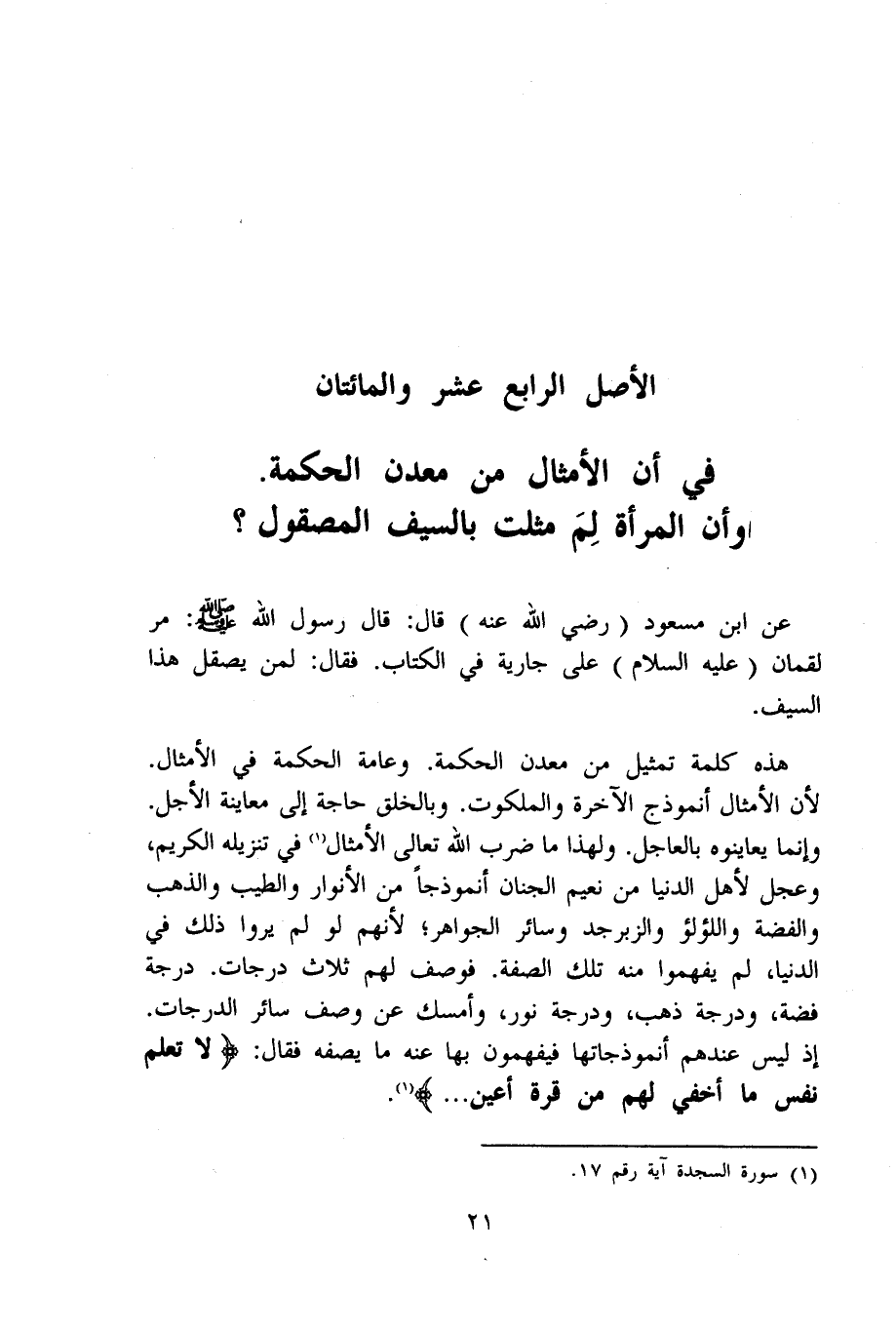 هَذِه كلمة تَمْثِيل من مَعْدن الْحِكْمَة وَعَامة الْحِكْمَة فِي الْأَمْثَال لِأَن الْأَمْثَال أنموذج الْآخِرَة والملكوت وبالخلق حَاجَة إِلَى مُعَاينَة الْأَجَل وَإِنَّمَا يعاينوه بالعاجل وَلِهَذَا مَا ضرب الله تَعَالَى الْأَمْثَال فِي تَنْزِيله الْكَرِيم وَعجل لأهل الدُّنْيَا من نعيم الْجنان أنموذجا من الْأَنْوَار وَالطّيب وَالذَّهَب وَالْفِضَّة واللؤلؤ والزبرجد وَسَائِر الْجَوَاهِر لأَنهم لَو لم يرَوا ذَلِك فِي الدُّنْيَا لم يفهموا مِنْهُ تِلْكَ الصّفة فوصف لَهُم ثَلَاث دَرَجَات دَرَجَة فضَّة ودرجة ذهب ودرجة نور وَأمْسك عَن وصف سَائِر الدَّرَجَات إِذْ لَيْسَ عِنْدهم أنموذجاتها فيفهمون بهَا عَنهُ مَا يصفه فَقَالَ {لَا تعلم نفس مَا أُخْفِي لَهُم من قُرَّة أعين}