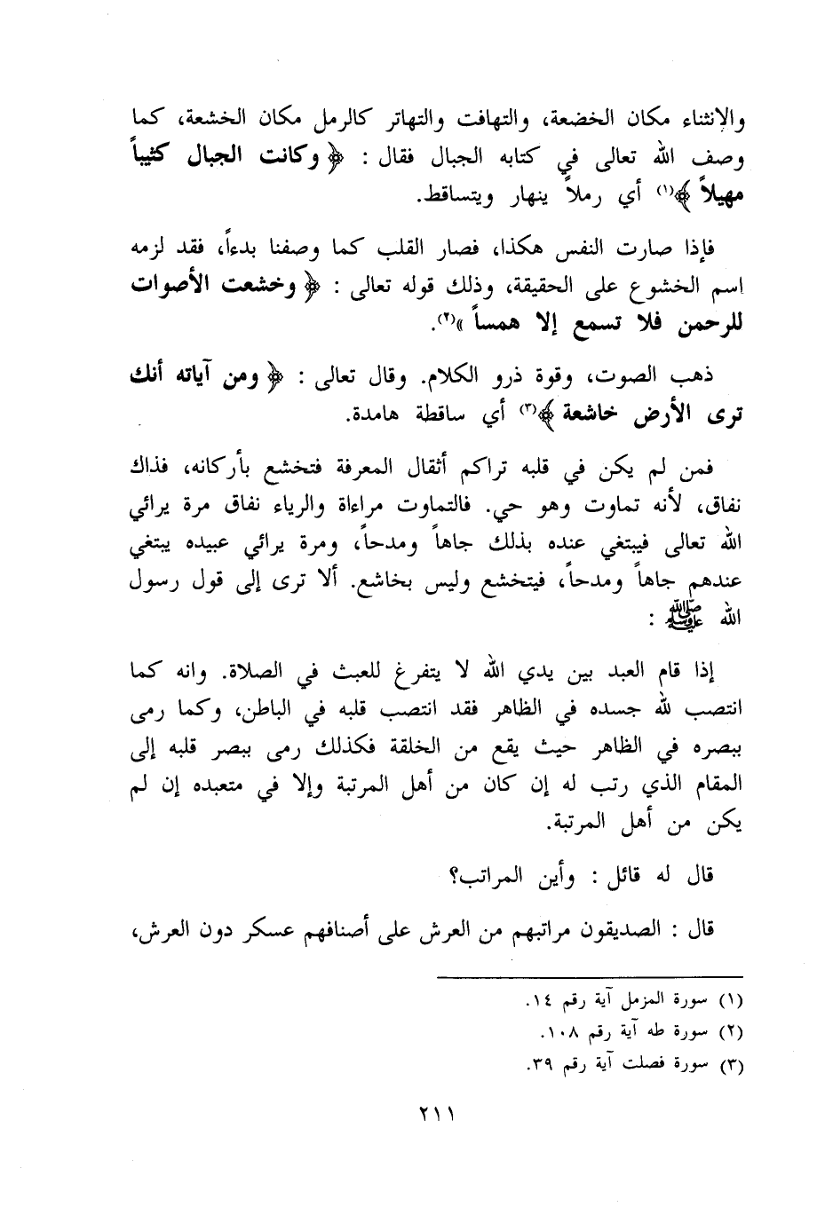 فَإِذا صَارَت النَّفس هَكَذَا فَصَارَ الْقلب كَمَا وَصفنَا بدءا فقد لزمَه اسْم الْخُشُوع على الْحَقِيقَة وَذَلِكَ قَوْله تَعَالَى {وخشعت الْأَصْوَات للرحمن فَلَا تسمع إِلَّا همسا}