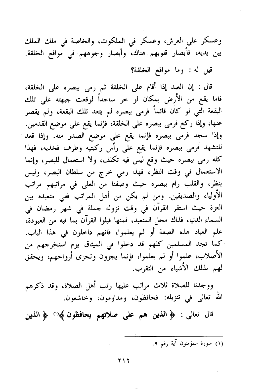 قَالَ إِن العَبْد إِذا أَقَامَ على الْخلقَة ثمَّ رمى ببصره على الْخلقَة فَأَما يَقع من الأَرْض بمَكَان لَو خر سَاجِدا لوقعت جَبهته على تِلْكَ الْبقْعَة الَّتِي لَو كَانَ قَائِما فَرمى ببصره لم يَتَعَدَّ تِلْكَ الْبقْعَة وَلم يقصر عَنْهَا وَإِذا ركع فَرمى ببصره على الْخلقَة فَإِنَّمَا يَقع على مَوضِع الْقَدَمَيْنِ وَإِذا سجد فَرمى ببصره فَإِنَّمَا يَقع على مَوضِع الصَّدْر مِنْهُ وَإِذا قعد للتَّشَهُّد فَرمى ببصره فَإِنَّمَا يَقع على رَأس رُكْبَتَيْهِ وطرف فَخذيهِ فَهَذَا كُله رمى ببصره حَيْثُ وَقع لَيْسَ فِيهِ تكلّف وَلَا اسْتِعْمَال لِلْبَصَرِ وَإِنَّمَا الِاسْتِعْمَال فِي وَقت النّظر فَهَذَا رمي خرج من سُلْطَان الْبَصَر وَلَيْسَ بِنَظَر وَالْقلب رام ببصره حَيْثُ وَصفنَا من العلى فِي مَرَاتِبهمْ مَرَاتِب الْأَوْلِيَاء وَالصديقين وَمن لم يكن من أهل الْمَرَاتِب فَفِي متعبده بَين الْعِزَّة حَيْثُ اسْتَقر الْقُرْآن فِي وَقت نُزُوله جملَة فِي شهر رَمَضَان فِي السَّمَاء الدُّنْيَا فَذَاك مَحل المتعبد فَمِنْهَا قبلوا الْقُرْآن بِمَا فِيهِ من العبودة علم الْعباد هَذِه الصّفة أَو لم يعلمُوا فَإِنَّهُم داخلون فِي هَذَا الْبَاب كَمَا تَجِد الْمُسلمين كلهم قد دخلُوا فِي الْمِيثَاق يَوْم استخرجهم من الأصلاب علمُوا أَو لم يعلمُوا فَإِنَّمَا يجزون وتجزى أَرْوَاحهم ويحقق لَهُم بذلك الْأَشْيَاء من التَّقَرُّب
