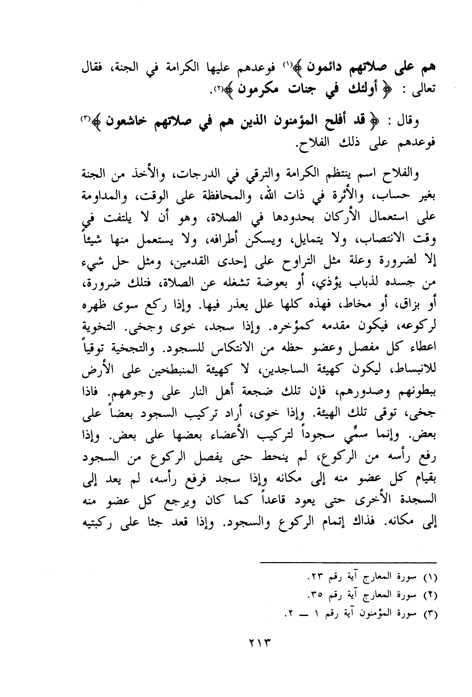 والفلاح اسْم يَنْتَظِم الْكَرَامَة والترقي فِي الدَّرَجَات وَالْأَخْذ من الْجنَّة بِغَيْر حِسَاب والأثرة فِي ذَات الله والمحافظة على الْوَقْت والمداومة على اسْتِعْمَال الْأَركان بحدودها فِي الصَّلَاة وَهُوَ أَن لَا يلْتَفت فِي وَقت الانتصاب وَلَا يتمايل ويسكن أَطْرَافه وَلَا يسْتَعْمل مِنْهَا شَيْئا إِلَّا لضَرُورَة وَعلة مثل الترواح على إِحْدَى الْقَدَمَيْنِ وَمثل حل شَيْء من جسده لذباب يُؤْذِي أَو بعوضة تشغله عَن الصَّلَاة فَتلك ضَرُورَة أَو بزاق أَو مخاط فَهَذِهِ كلهَا علل يعْذر فِيهَا وَإِذا ركع سوى ظَهره لركوعه فَيكون مقدمه كمؤخره وَإِذا سجد خوى وجخى التخوية إِعْطَاء كل مفصل وعضو حَظه من الانتكاس للسُّجُود والتجخية توقيا للانبساط ليَكُون كَهَيئَةِ الساجدين لَا كَهَيئَةِ المنبطحين على الأَرْض ببطونهم وصدورهم فَإِن تِلْكَ ضجعة أهل النَّار على وُجُوههم فَإِذا جخى توقى تِلْكَ الْهَيْئَة وَإِذا خوى أَرَادَ تركيب السُّجُود بَعْضًا على بعض وَإِنَّمَا سمي سجودا لتركيب الْأَعْضَاء بَعْضهَا على بعض وَإِذا رفع رَأسه من الرُّكُوع لم ينحط حَتَّى يفصل الرُّكُوع من السُّجُود بِقِيَام كل عُضْو مِنْهُ إِلَى مَكَانَهُ وَإِذا سجد فَرفع رَأسه لم يعد إِلَى السَّجْدَة الْأُخْرَى حَتَّى يعود قَاعِدا كَمَا كَانَ وَيرجع كل عُضْو مِنْهُ إِلَى مَكَانَهُ فَذَاك إتْمَام الرُّكُوع وَالسُّجُود وَإِذا قعد جثا على رُكْبَتَيْهِ
