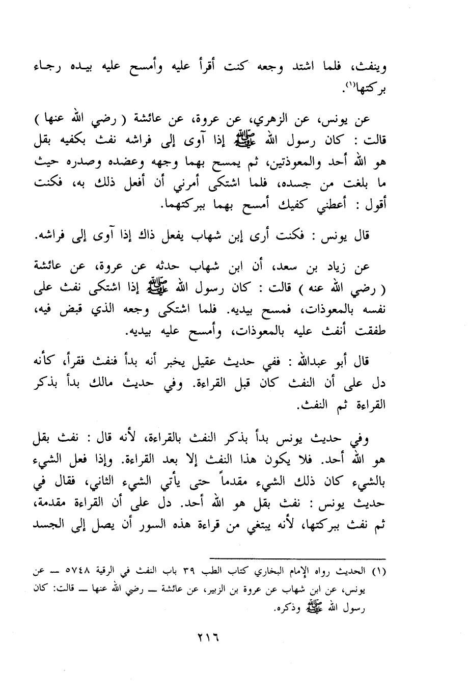 وَفِي حَدِيث يُونُس بَدَأَ بِذكر النفث بِالْقِرَاءَةِ لِأَنَّهُ قَالَ نفث بقل هُوَ الله أحد فَلَا يكون هَذَا النفث إِلَّا بعد الْقِرَاءَة وَإِذا فعل الشَّيْء بالشَّيْء كَانَ ذَلِك الشَّيْء مقدما حَتَّى يَأْتِي الشَّيْء الثَّانِي فَقَالَ فِي حَدِيث يُونُس نفث بقل هُوَ الله أحد دلّ على أَن الْقِرَاءَة مُقَدّمَة ثمَّ نفث ببركتها لِأَنَّهُ يَبْتَغِي من قِرَاءَة هَذِه السُّور أَن يصل إِلَى الْجَسَد