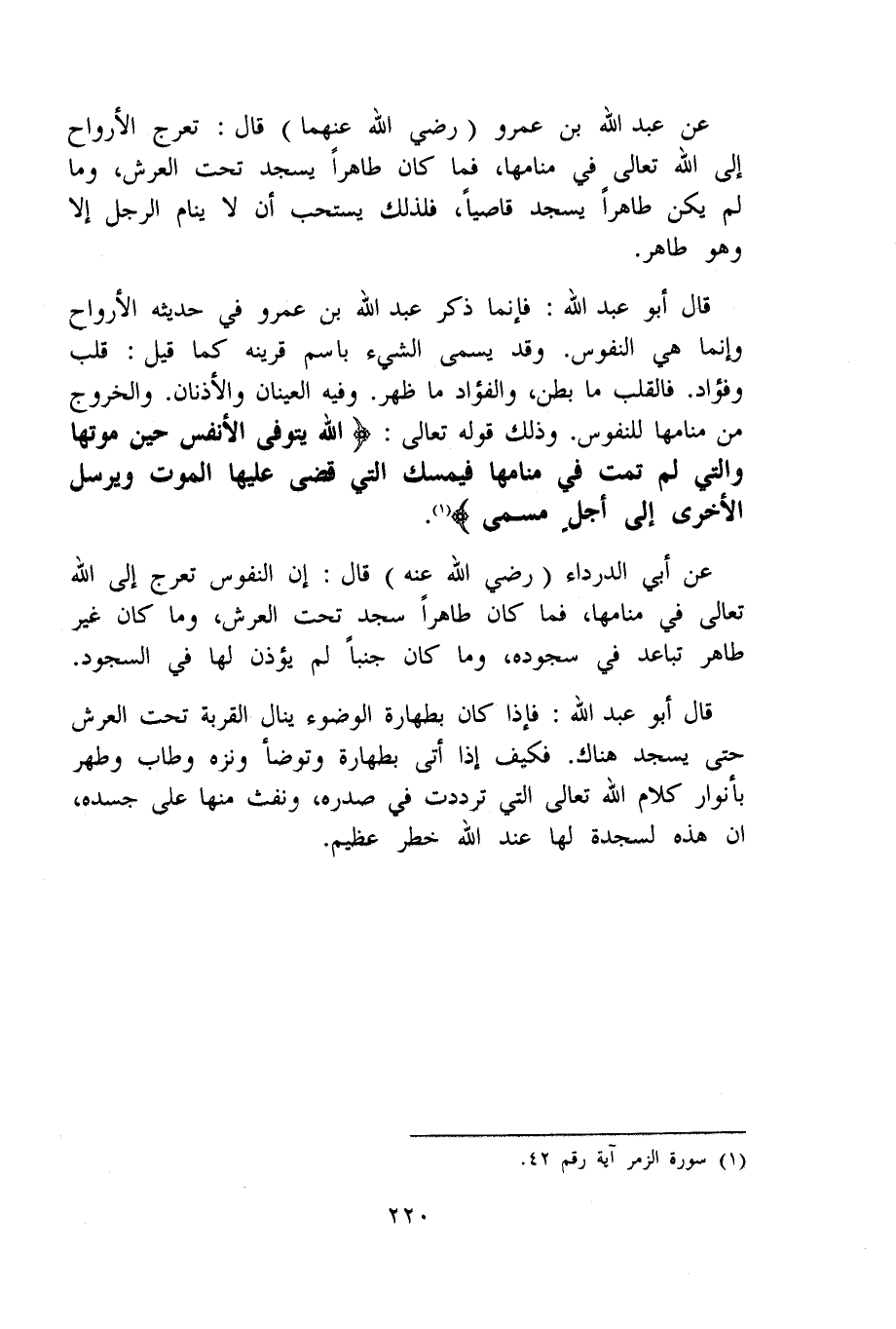 عَن عبد الله بن عَمْرو رَضِي الله عَنْهُمَا قَالَ تعرج الْأَرْوَاح إِلَى الله تَعَالَى فِي منامها فَمَا كَانَ طَاهِرا يسْجد تَحت الْعَرْش وَمَا لم يكن طَاهِرا يسْجد قاصيا فَلذَلِك يسْتَحبّ أَن لَا ينَام الرجل إِلَّا وَهُوَ طَاهِر