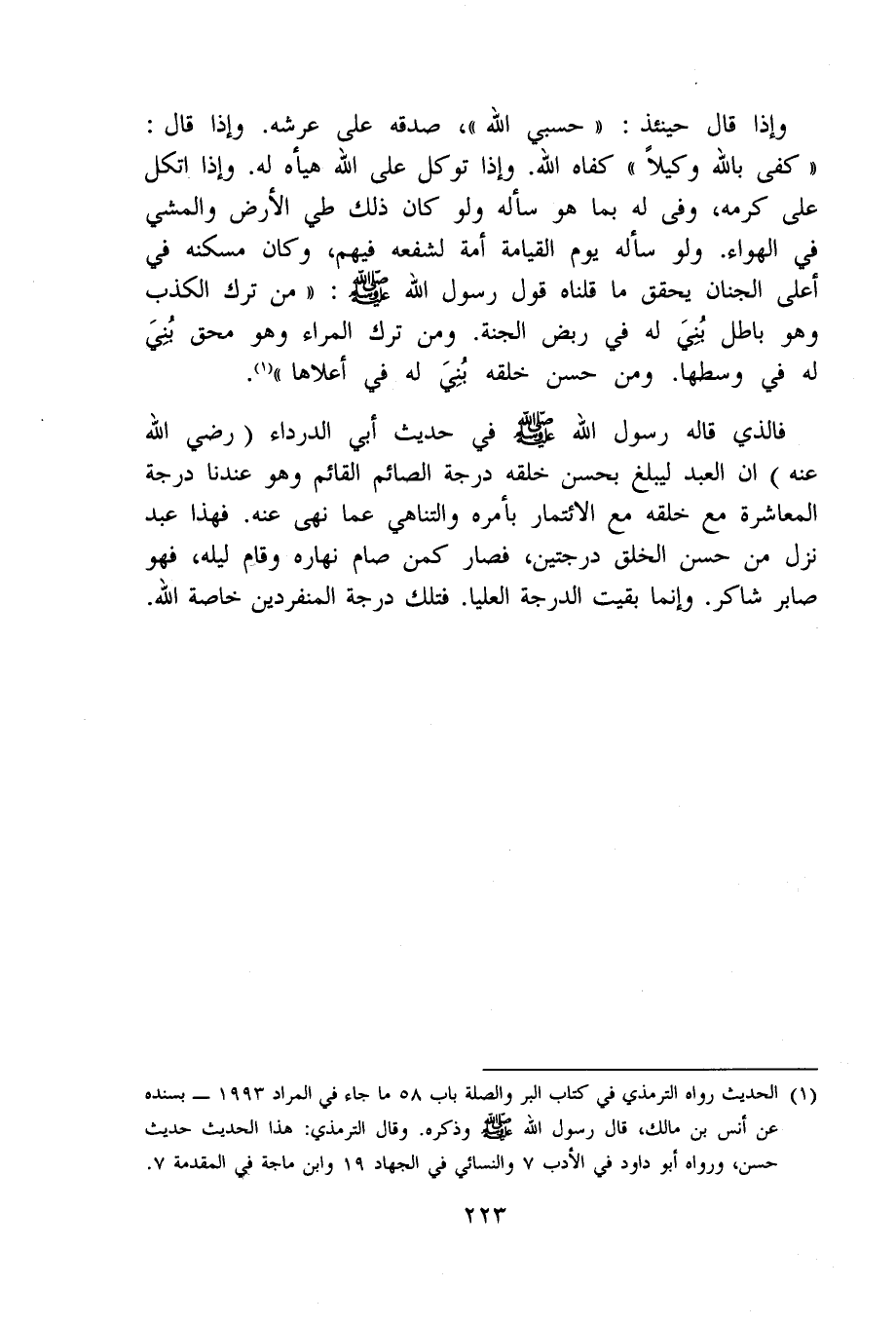 فَالَّذِي قَالَه رَسُول الله صلى الله عَلَيْهِ وَسلم فِي حَدِيث أبي الدَّرْدَاء رَضِي الله عَنهُ إِن العَبْد ليبلغ بِحسن خلقه دَرَجَة الصَّائِم الْقَائِم وَهُوَ عندنَا دَرَجَة المعاشرة مَعَ خلقه مَعَ الائتمار بأَمْره والتناهي عَمَّا نهى عَنهُ فَهَذَا عبد نزل من حسن الْخلق دَرَجَتَيْنِ فَصَارَ كمن صَامَ نَهَاره وَقَامَ ليله فَهُوَ صابر شَاكر وَإِنَّمَا بقيت الدرجَة الْعليا فَتلك دَرَجَة المنفردين خَاصَّة الله
