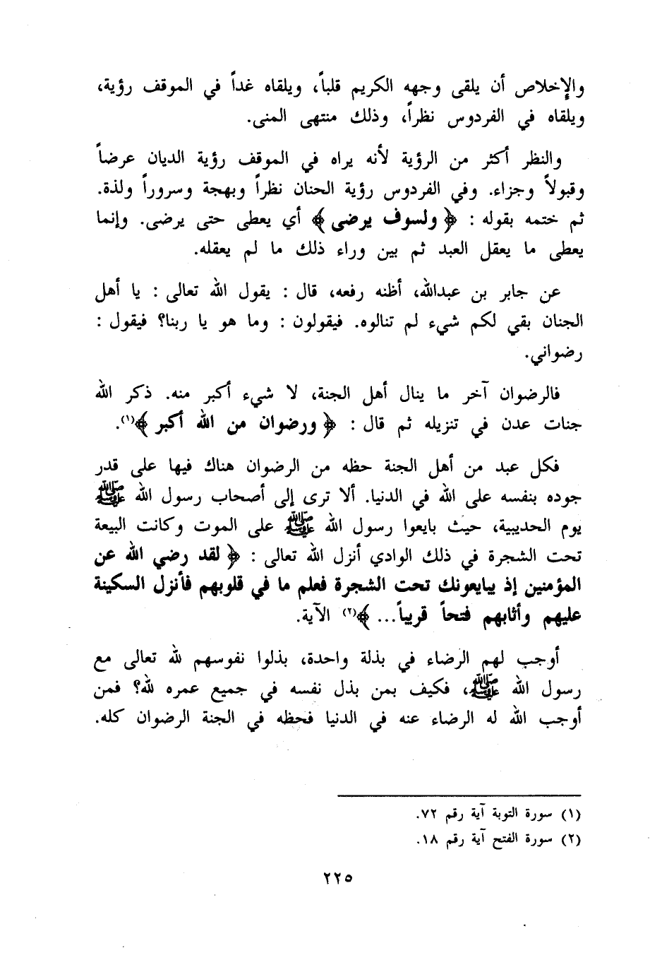 فَكل عبد من أهل الْجنَّة حَظه من الرضْوَان هُنَاكَ فِيهَا على قدر جوده بِنَفسِهِ على الله فِي الدُّنْيَا أَلا ترى إِلَى أَصْحَاب رَسُول الله صلى الله عَلَيْهِ وَسلم يَوْم الْحُدَيْبِيَة حَيْثُ بَايعُوا رَسُول الله صلى الله عَلَيْهِ وَسلم على الْمَوْت وَكَانَت الْبيعَة تَحت الشَّجَرَة فِي ذَلِك الْوَادي أنزل الله تَعَالَى {لقد رَضِي الله عَن الْمُؤمنِينَ إِذْ يُبَايعُونَك تَحت الشَّجَرَة فَعلم مَا فِي قُلُوبهم فَأنْزل السكينَة عَلَيْهِم وأثابهم فتحا قَرِيبا} الْآيَة