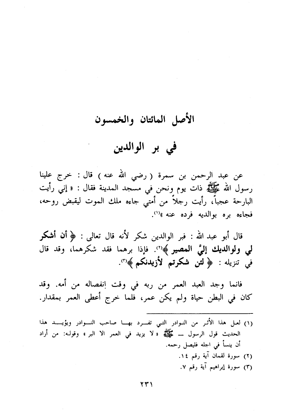 عَن عبد الرَّحْمَن بن سَمُرَة رَضِي الله عَنهُ قَالَ خرج علينا رَسُول الله صلى الله عَلَيْهِ وَسلم ذَات يَوْم وَنحن فِي مَسْجِد الْمَدِينَة فَقَالَ إِنِّي رَأَيْت البارحة عجبا رَأَيْت رجلا من أمتِي جَاءَهُ ملك الْمَوْت ليقْبض روحه فَجَاءَهُ بره بِوَالِديهِ فَرده عَنهُ