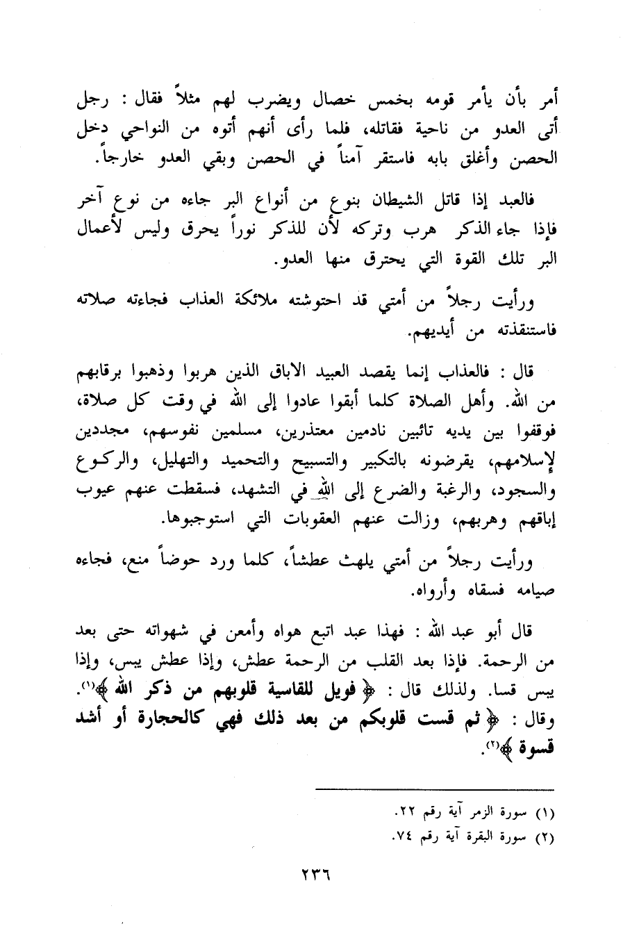 قَالَ أَبُو عبد الله فَهَذَا عبد اتبع هَوَاهُ وأمعن فِي شهواته حَتَّى بعد من الرَّحْمَة فَإِذا بعد الْقلب من الرَّحْمَة عَطش وَإِذا عَطش يبس وَإِذا يبس قسا وَلذَلِك قَالَ {فويل للقاسية قُلُوبهم من ذكر الله} وَقَالَ {ثمَّ قست قُلُوبكُمْ من بعد ذَلِك فَهِيَ كالحجارة أَو أَشد قسوة}