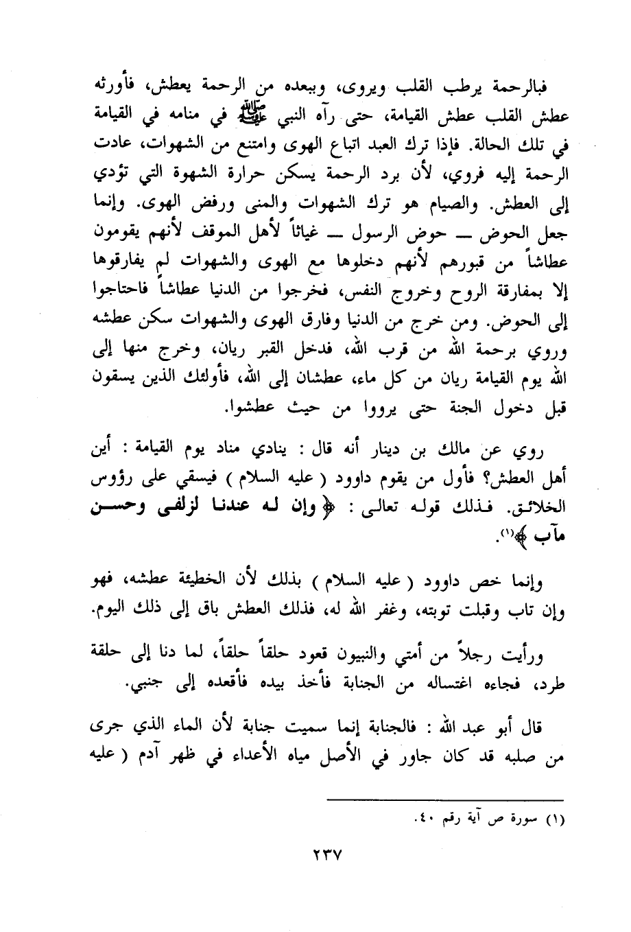 رُوِيَ عَن مَالك بن دِينَار أَنه قَالَ يُنَادي مُنَاد يَوْم الْقِيَامَة أَيْن أهل الْعَطش فَأول من يقوم دَاوُود عَلَيْهِ السَّلَام فيسقي على رُؤُوس الْخَلَائق فَذَلِك قَوْله تَعَالَى {وَإِن لَهُ عندنَا لزلفى وَحسن مآب}