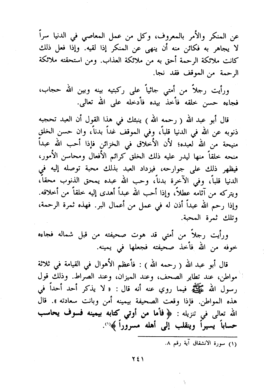 قَالَ أَبُو عبد الله رَحمَه الله فأعظم الْأَهْوَال فِي الْقِيَامَة فِي ثَلَاثَة مَوَاطِن عِنْد تطاير الصُّحُف وَعند الْمِيزَان وَعند الصِّرَاط وَذَلِكَ قَول رَسُول الله صلى الله عَلَيْهِ وَسلم فِيمَا رُوِيَ عَنهُ أَنه قَالَ لَا يذكر أحد أحدا فِي هَذِه المواطن فَإِذا وَقعت الصَّحِيفَة بِيَمِينِهِ أَمن وَبَانَتْ سعادته قَالَ الله تَعَالَى فِي تَنْزِيله {فَأَما من أُوتِيَ كِتَابه بِيَمِينِهِ فَسَوف يُحَاسب حسابا يَسِيرا وينقلب إِلَى أَهله مَسْرُورا}