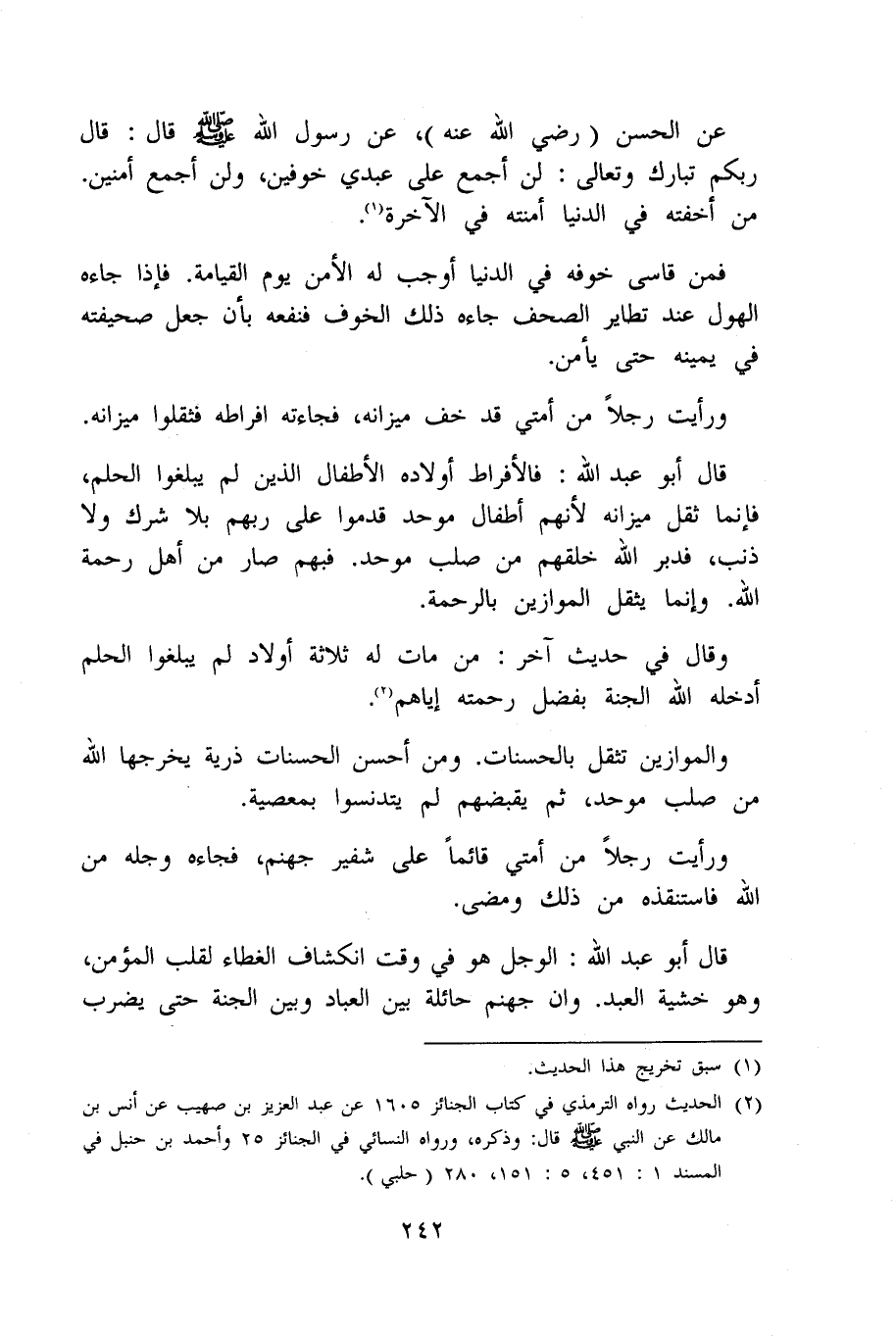 قَالَ أَبُو عبد الله فالأفراط أَوْلَاده الْأَطْفَال الَّذين لم يبلغُوا الْحلم فَإِنَّمَا ثقل مِيزَانه لأَنهم أَطْفَال موحد قدمُوا على رَبهم بِلَا شرك وَلَا ذَنْب فدبر الله خلقهمْ من صلب موحد فبهم صَار من أهل رَحْمَة الله وَإِنَّمَا يثقل الموازين بِالرَّحْمَةِ