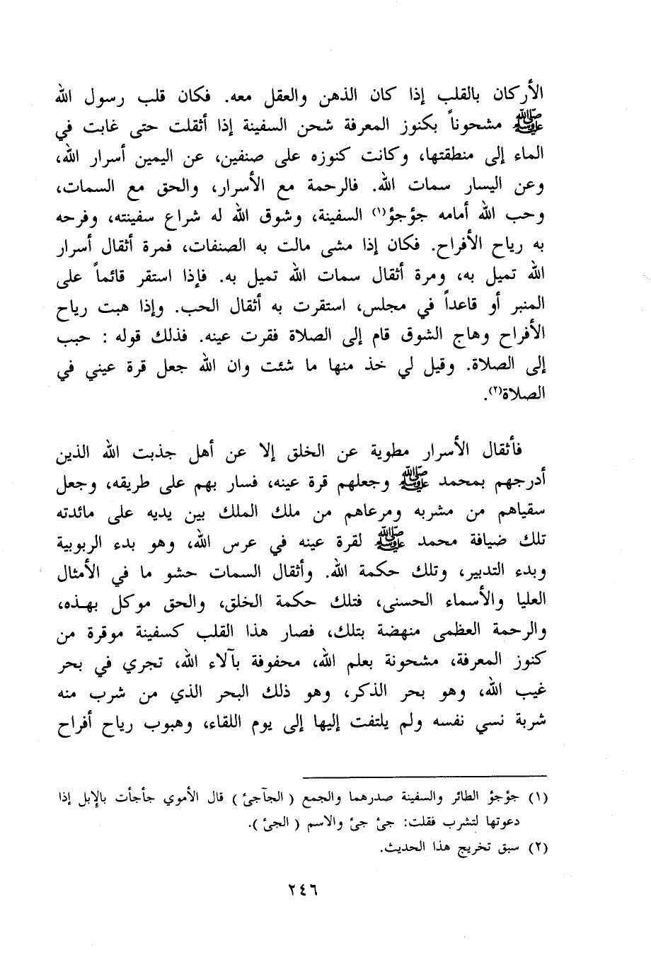 الْأَركان بِالْقَلْبِ إِذا كَانَ الذِّهْن وَالْعقل مَعَه فَكَانَ قلب رَسُول الله صلى الله عَلَيْهِ وَسلم مشحونا بكنوز الْمعرفَة شحن السَّفِينَة إِذا أثقلت حَتَّى غَابَتْ فِي المَاء إِلَى منطقتها وَكَانَت كنوزه على صنفين عَن الْيَمين أسرار الله وَعَن الْيَسَار سمات الله فالرحمة مَعَ الْأَسْرَار وَالْحق مَعَ السمات وَحب الله أَمَامه جؤجؤ السَّفِينَة وشوق الله لَهُ شراع سفينته وفرحه بِهِ ريَاح الأفراح فَكَانَ إِذا مَشى مَالَتْ بِهِ الصنفات فَمرَّة أثقال أسرار الله تميل بِهِ وَمرَّة أثقال سمات الله تميل بِهِ فَإِذا اسْتَقر قَائِما على الْمِنْبَر أَو قَاعِدا فِي مجْلِس اسْتَقَرَّتْ بِهِ أثقال الْحبّ وَإِذا هبت ريَاح الأفراح وهاج الشوق قَامَ إِلَى الصَّلَاة فقرت عينه فَذَلِك قَوْله (حبب إِلَيّ الصَّلَاة وَقيل لي خُذ مِنْهَا مَا شِئْت وَإِن الله جعل قُرَّة عَيْني فِي الصَّلَاة)