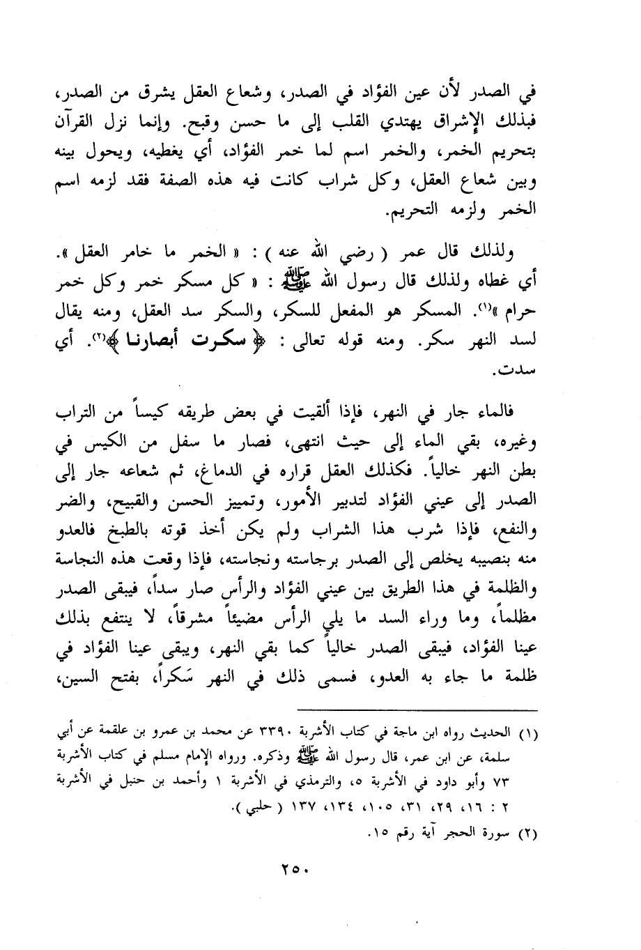 فالماء جَار فِي النَّهر فَإِذا ألقيت فِي بعض طَرِيقه كيسا من التُّرَاب وَغَيره بَقِي المَاء إِلَى حَيْثُ انْتهى فَصَارَ مَا سفل من الْكيس فِي بطن النَّهر خَالِيا فَكَذَلِك الْعقل قراره فِي الدِّمَاغ ثمَّ شعاعه جَار إِلَى الصَّدْر إِلَى عَيْني الْفُؤَاد لتدبير الْأُمُور وتمييز الْحسن والقبيح والضر والنفع فَإِذا شرب هَذَا الشَّرَاب وَلم يكن أَخذ قوته بالطبخ فالعدو مِنْهُ بِنَصِيبِهِ يخلص إِلَى الصَّدْر برجاسته ونجاسته فَإِذا وَقعت هَذِه النَّجَاسَة والظلمة فِي هَذَا الطَّرِيق بَين عَيْني الْفُؤَاد وَالرَّأْس صَار سدا فَيبقى الصَّدْر مظلما وَمَا وَرَاء السد مَا يَلِي الرَّأْس مضيئا مشرقا لَا ينْتَفع بذلك عينا الْفُؤَاد فَيبقى الصَّدْر خَالِيا كَمَا بَقِي النَّهر وَيبقى عينا الْفُؤَاد فِي ظلمَة مَا جَاءَ بِهِ الْعَدو فَسمى ذَلِك فِي النَّهر سكرا بِفَتْح السِّين