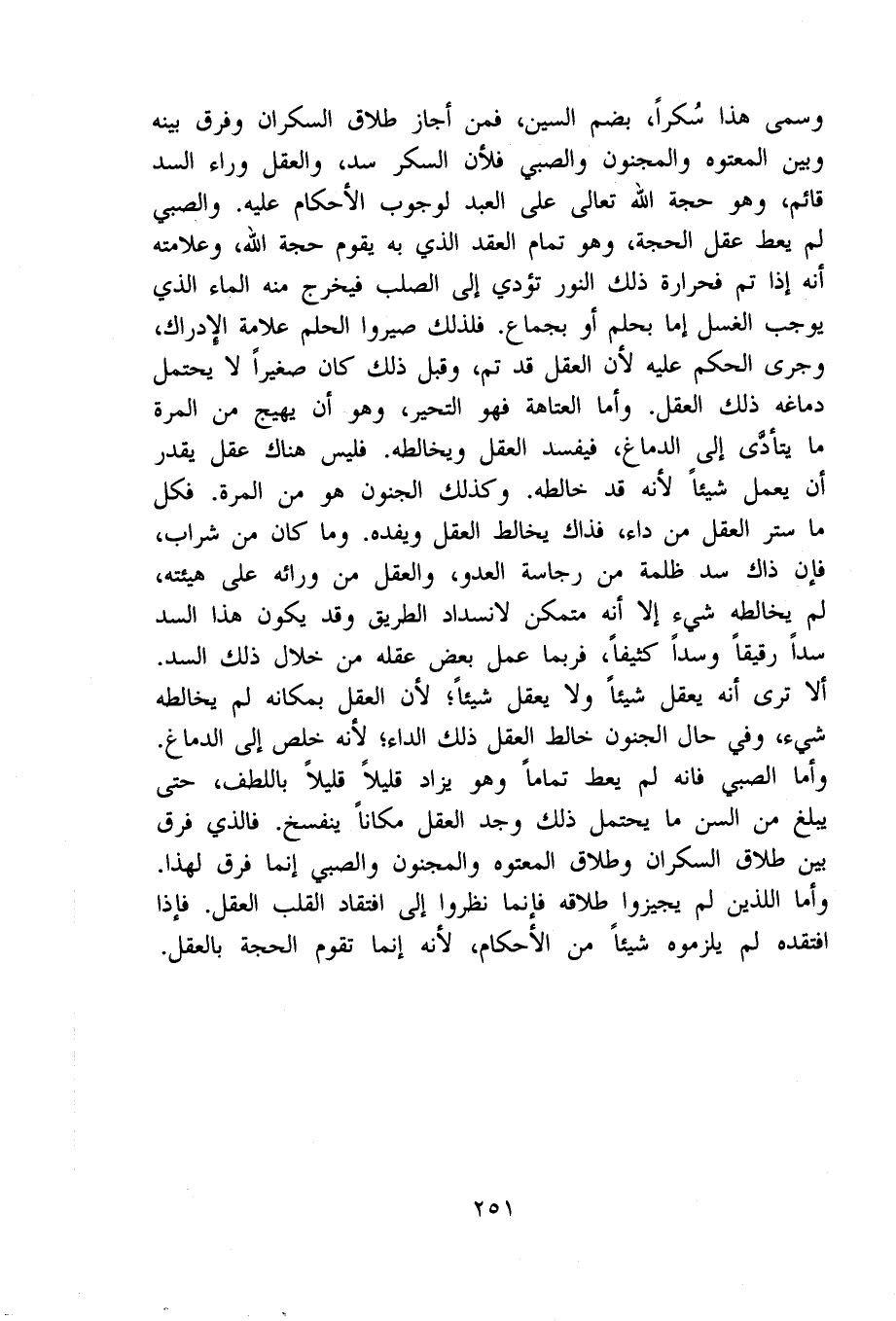 وسمى هَذَا سكرا بِضَم السِّين فَمن أجَاز طَلَاق السَّكْرَان وَفرق بَينه وَبَين الْمَعْتُوه وَالْمَجْنُون وَالصَّبِيّ فَلِأَن السكر سد وَالْعقل وَرَاء السد قَائِم وَهُوَ حجَّة الله تَعَالَى على العَبْد لوُجُوب الْأَحْكَام عَلَيْهِ وَالصَّبِيّ لم يُعْط عقل الْحجَّة وَهُوَ تَمام العقد الَّذِي بِهِ يقوم حجَّة الله وعلامته أَنه إِذا تمّ فحرارة ذَلِك النُّور تُؤدِّي إِلَى الصلب فَيخرج مِنْهُ المَاء الَّذِي يُوجب الْغسْل إِمَّا بحلم أَو بجماع فَلذَلِك صيروا الْحلم عَلامَة الْإِدْرَاك وَجرى الحكم عَلَيْهِ لِأَن الْعقل قد تمّ وَقبل ذَلِك كَانَ صَغِيرا لَا يحْتَمل دماغه ذَلِك الْعقل وَأما العتاهة فَهُوَ التحير وَهُوَ أَن يهيج من الْمرة مَا يتَأَدَّى إِلَى الدِّمَاغ فَيفْسد الْعقل ويخالطه فَلَيْسَ هُنَاكَ عقل يقدر أَن يعْمل شَيْئا لِأَنَّهُ قد خالطه وَكَذَلِكَ الْجُنُون هُوَ من الْمرة فَكل مَا ستر الْعقل من دَاء فَذَاك يخالط الْعقل ويفده وَمَا كَانَ من شراب فَإِن ذَاك سد ظلمَة من رجاسة الْعَدو وَالْعقل من وَرَائه على هَيئته لم يخالطه شَيْء إِلَّا أَنه مُتَمَكن لانسداد الطَّرِيق وَقد يكون هَذَا السد سدا رَقِيقا وسدا كثيفا فَرُبمَا عمل بعض عقله من خلال ذَلِك السد أَلا ترى أَنه يعقل شَيْئا وَلَا يعقل شَيْئا لِأَن الْعقل بمكانه لم يخالطه شَيْء وَفِي حَال الْجُنُون خالط الْعقل ذَلِك الدَّاء لِأَنَّهُ خلص إِلَى الدِّمَاغ وَأما الصَّبِي فَإِنَّهُ لم يُعْط تَمامًا وَهُوَ يُزَاد قَلِيلا قَلِيلا باللطف حَتَّى يبلغ من السن مَا يحْتَمل ذَلِك وجد الْعقل مَكَانا يَنْفَسِخ فَالَّذِي فرق بَين طَلَاق السَّكْرَان وَطَلَاق الْمَعْتُوه وَالْمَجْنُون وَالصَّبِيّ إِنَّمَا فرق لهَذَا وَأما اللَّذين لم يجيزوا طَلَاقه فَإِنَّمَا نظرُوا إِلَى افتقاد الْقلب الْعقل فَإِذا افتقده لم يلزموه شَيْئا من الْأَحْكَام لِأَنَّهُ إِنَّمَا تقوم الْحجَّة بِالْعقلِ