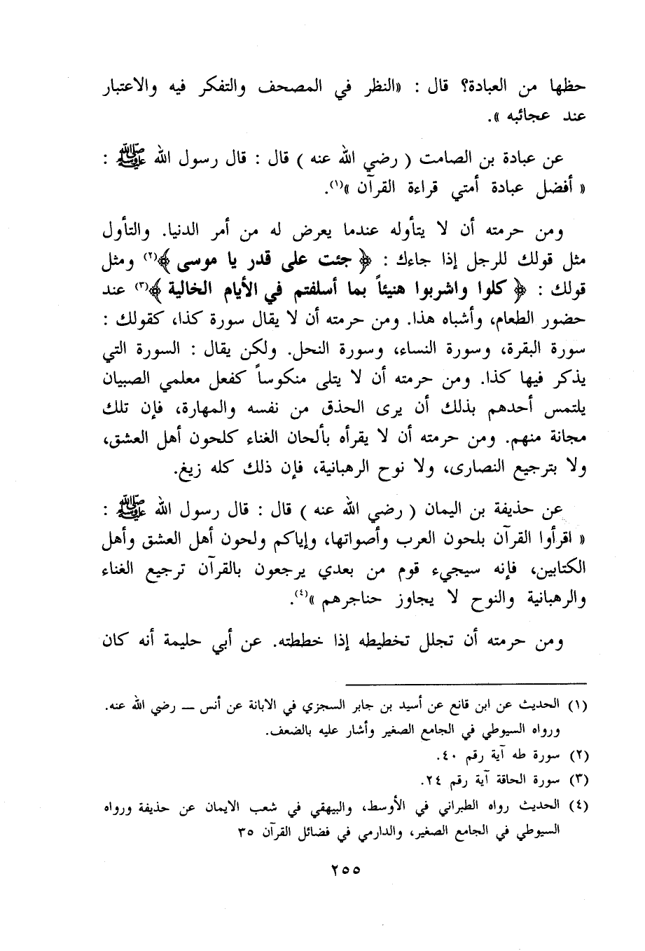 وَمن حرمته أَن لَا يتأوله عِنْدَمَا يعرض لَهُ من أَمر الدُّنْيَا والتأول مثل قَوْلك للرجل إِذا جَاءَك {جِئْت على قدر يَا مُوسَى} وَمثل قَوْلك {كلوا وَاشْرَبُوا هَنِيئًا بِمَا أسلفتم فِي الْأَيَّام الخالية} عِنْد حُضُور الطَّعَام وَأَشْبَاه هَذَا وَمن حرمته أَن لَا يُقَال سُورَة كَذَا كَقَوْلِك سُورَة الْبَقَرَة وَسورَة النِّسَاء وَسورَة النَّحْل وَلَكِن يُقَال السُّورَة الَّتِي يذكر فِيهَا كَذَا وَمن حرمته أَن لَا يُتْلَى منكوسا كَفعل معلمي الصّبيان يلْتَمس أحدهم بذلك أَن يرى الحذق من نَفسه والمهارة فَإِن تِلْكَ مجانة مِنْهُم وَمن حرمته أَن لَا يقرأه بألحان الْغناء كلحون أهل الْعِشْق وَلَا بترجيع النَّصَارَى وَلَا نوح الرهبانية فَإِن ذَلِك كُله زيغ