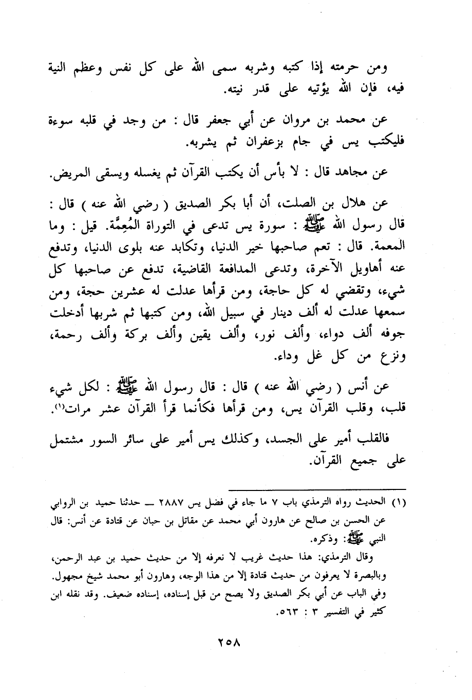 عَن هِلَال بن الصَّلْت أَن أَبَا بكر الصّديق رَضِي الله عَنهُ قَالَ قَالَ رَسُول الله صلى الله عَلَيْهِ وَسلم سُورَة يس تدعى فِي التَّوْرَاة المعمة قيل وَمَا المعمة قَالَ تعم صَاحبهَا خير الدُّنْيَا وتكابد عَنهُ بلوى الدُّنْيَا وتدفع عَنهُ أهاويل الْآخِرَة وتدعى المدافعة القاضية تدفع عَن صَاحبهَا كل شَيْء وتقضي لَهُ كل حَاجَة وَمن قَرَأَهَا عدلت لَهُ عشْرين حجَّة وَمن سَمعهَا عدلت لَهُ ألف دِينَار فِي سَبِيل الله وَمن كتبهَا ثمَّ شربهَا أدخلت جَوْفه ألف دَوَاء وَألف نور وَألف يَقِين وَألف بركَة وَألف رَحْمَة وَنزع من كل غل وداء