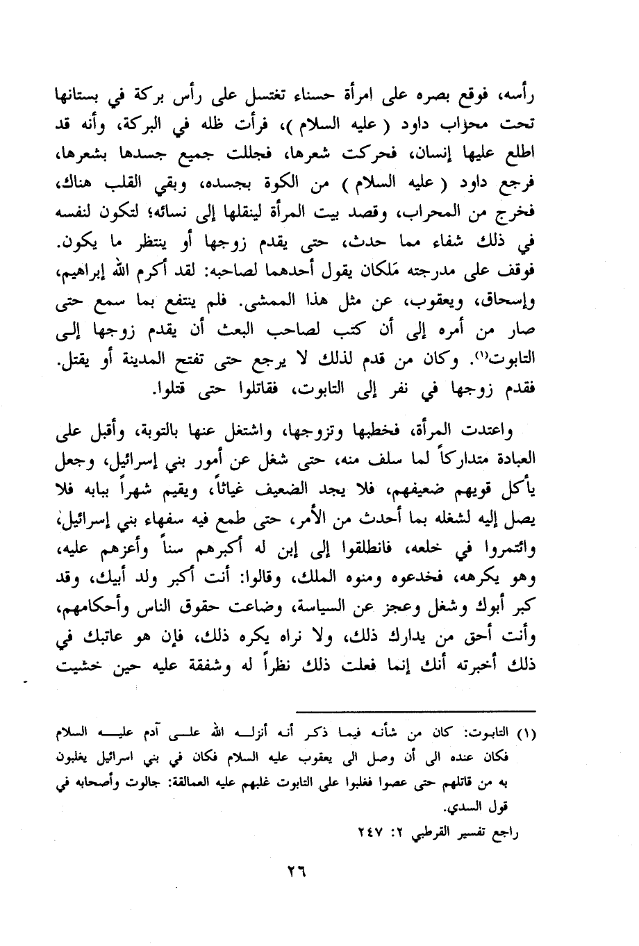 رَأسه فَوَقع بَصَره على امْرَأَة حسناء تَغْتَسِل على رَأس بركَة فِي بستانها تَحت محراب دَاوُد عَلَيْهِ السَّلَام فرأت ظله فِي الْبركَة وَأَنه قد اطلع عَلَيْهَا إِنْسَان فحركت شعرهَا فجللت جَمِيع جَسدهَا بشعرها فَرجع دَاوُد عَلَيْهِ السَّلَام من الكوة بجسده وَبَقِي الْقلب هُنَاكَ فَخرج من الْمِحْرَاب وَقصد بَيت الْمَرْأَة لينقلها إِلَى نِسَائِهِ لتَكون لنَفسِهِ فِي ذَلِك شِفَاء مِمَّا حدث حَتَّى يقدم زَوجهَا أَو ينْتَظر مَا يكون فَوقف على مدرجته ملكان يَقُول أَحدهمَا لصَاحبه لقد أكْرم الله إِبْرَاهِيم وَإِسْحَاق وَيَعْقُوب عَن مثل هَذَا الممشى فَلم ينْتَفع بِمَا سمع حَتَّى صَار من أمره إِلَى أَن كتب لصَاحب الْبَعْث أَن يقدم زَوجهَا إِلَى التابوت وَكَانَ من قدم لذَلِك لَا يرجع حَتَّى تفتح الْمَدِينَة أَو يقتل فَقدم زَوجهَا فِي نفر إِلَى التابوت فَقَاتلُوا حَتَّى قتلوا