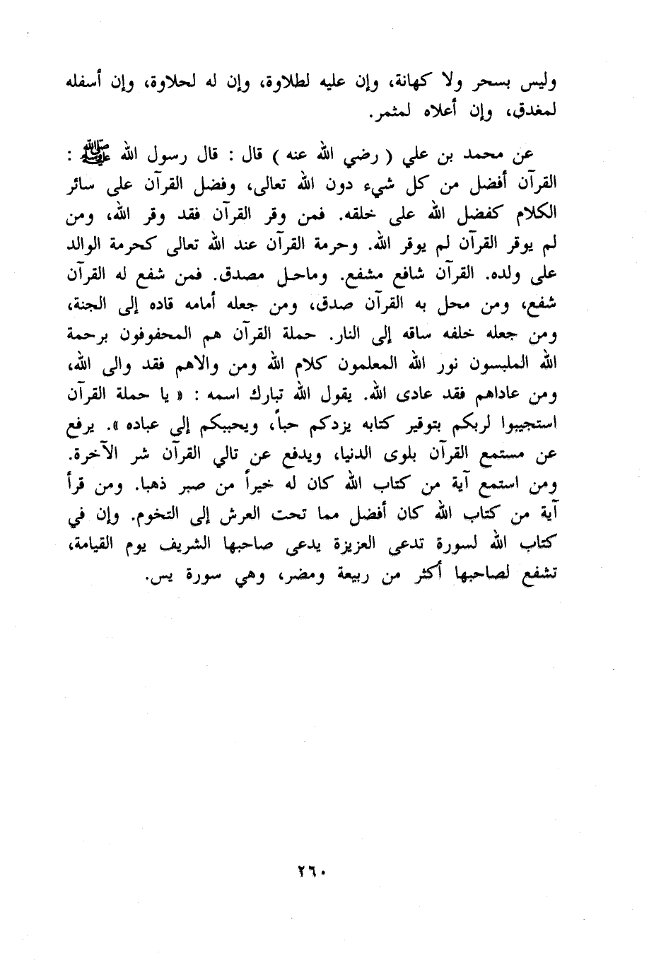 عَن مُحَمَّد بن عَليّ رَضِي الله عَنهُ قَالَ قَالَ رَسُول الله صلى الله عَلَيْهِ وَسلم الْقُرْآن أفضل من كل شَيْء دون الله تَعَالَى وَفضل الْقُرْآن على سَائِر الْكَلَام كفضل الله على خلقه فَمن وقر الْقُرْآن فقد وقر الله وَمن لم يوقر الْقُرْآن لم يوقر الله وَحُرْمَة الْقُرْآن عِنْد الله تَعَالَى كَحُرْمَةِ الْوَالِد على وَلَده الْقُرْآن شَافِع مُشَفع وَمَا حل مُصدق فَمن شفع لَهُ الْقُرْآن شفع وَمن مَحل بِهِ الْقُرْآن صدق وَمن جعله أَمَامه قَادَهُ إِلَى الْجنَّة وَمن جعله خَلفه سَاقه إِلَى النَّار حَملَة الْقُرْآن هم المحفوفون برحمة الله الملبسون نور الله المعلمون كَلَام الله وَمن والاهم فقد والى الله وَمن عاداهم فقد عادى الله يَقُول الله تبَارك اسْمه يَا حَملَة الْقُرْآن اسْتجِيبُوا لربكم بتوقير كِتَابه يزدكم حبا ويحببكم إِلَى عباده يرفع عَن مستمع الْقُرْآن بلوى الدُّنْيَا وَيدْفَع عَن تالي الْقُرْآن شَرّ الْآخِرَة وَمن اسْتمع آيَة من كتاب الله كَانَ لَهُ خيرا من صَبر ذَهَبا وَمن قَرَأَ آيَة من كتاب الله كَانَ أفضل مِمَّا تَحت الْعَرْش إِلَى التخوم وَإِن فِي كتاب الله لسورة تدعى العزيزة يدعى صَاحبهَا الشريف يَوْم الْقِيَامَة تشفع لصَاحِبهَا أَكثر من ربيعَة وَمُضر وَهِي سُورَة يس