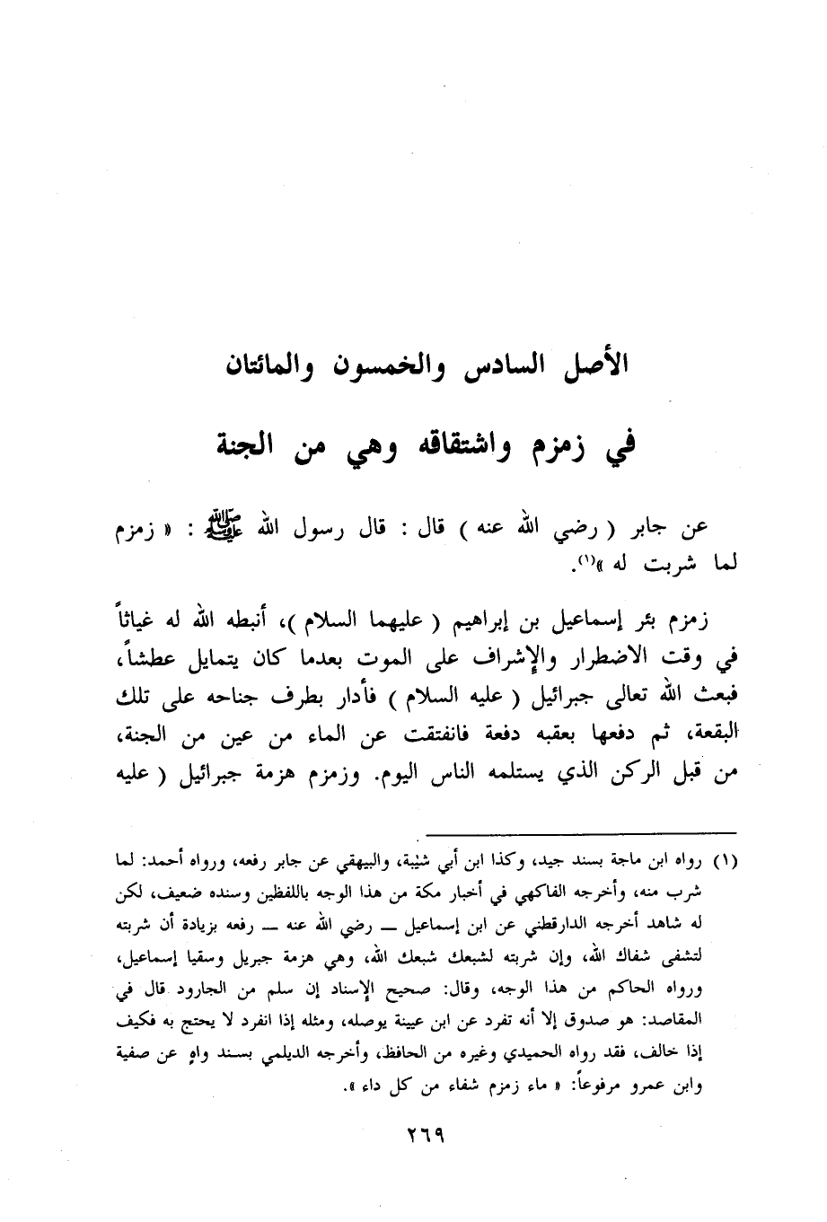زَمْزَم بِئْر إِسْمَاعِيل بن إِبْرَاهِيم عَلَيْهِمَا السَّلَام أنبطه الله لَهُ غياثا فِي وَقت الِاضْطِرَار والإشراف على الْمَوْت بَعْدَمَا كَانَ يتمايل عطشا فَبعث الله تَعَالَى جِبْرَائِيل عَلَيْهِ السَّلَام فأدار بِطرف جنَاحه على تِلْكَ الْبقْعَة ثمَّ دَفعهَا بعقبه دفْعَة فانفتقت عَن المَاء من عين من الْجنَّة من قبل الرُّكْن الَّذِي يستلمه النَّاس الْيَوْم وزمزم هزمة جِبْرَائِيل عَلَيْهِ
