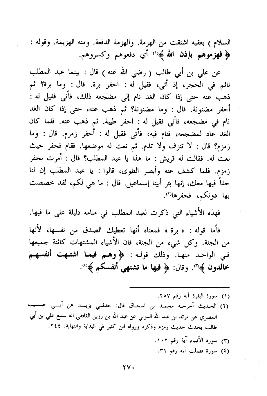 عَن عَليّ بن أبي طَالب رَضِي الله عَنهُ قَالَ بَيْنَمَا عبد الْمطلب نَائِم فِي الْحجر إِذْ أَتَى فَقيل لَهُ احْفِرْ برة قَالَ وَمَا برة ثمَّ ذهب عَنهُ حَتَّى إِذا كَانَ الْغَد نَام إِلَى مضجعه ذَلِك فَأتى فَقيل لَهُ أحفر مضنونة قَالَ وَمَا مضنونة ثمَّ ذهب عَنهُ حَتَّى إِذا كَانَ الْغَد نَام فِي مضجعه فَأتى فَقيل لَهُ احْفِرْ طيبَة ثمَّ ذهب عَنهُ فَلَمَّا كَانَ الْغَد عَاد لمضجعه فَنَامَ فِيهِ فَأتى فَقيل لَهُ أحفر زَمْزَم قَالَ وَمَا زَمْزَم قَالَ لَا تنزف وَلَا تذم ثمَّ نعت لَهُ موضعهَا فَقَامَ فحفر حَيْثُ نعت لَهُ فَقَالَت لَهُ قُرَيْش مَا هَذَا يَا عبد الْمطلب قَالَ أمرت بِحَفر زَمْزَم فَلَمَّا كشف عَنهُ وَأبْصر الطوى قَالُوا يَا عبد الْمطلب إِن لنا حَقًا فِيهَا مَعَك إِنَّهَا بِئْر أَبينَا إِسْمَاعِيل قَالَ مَا هِيَ لكم لقد خصصت بهَا دونكم فحفرها