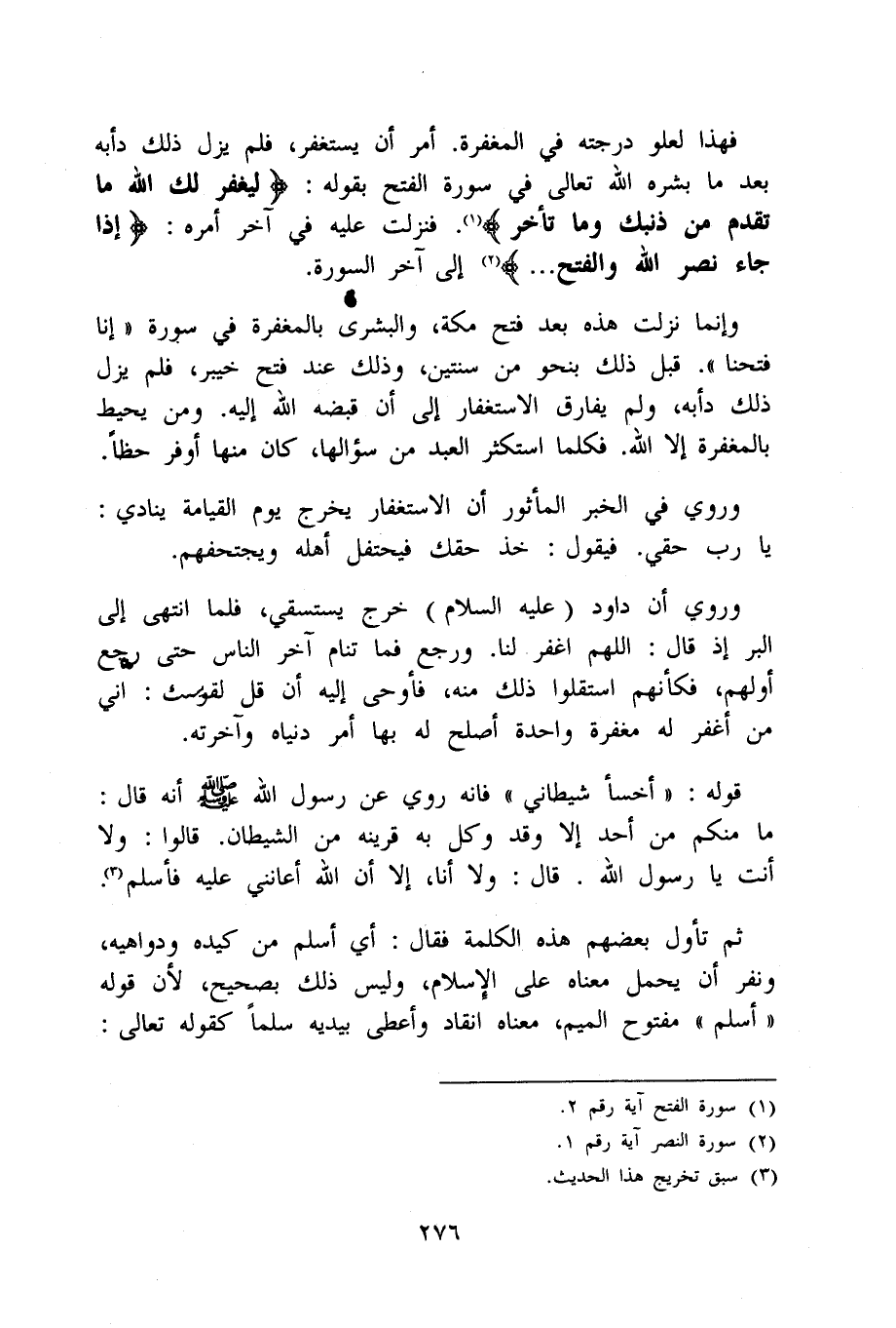 فَهَذَا لعلو دَرَجَته فِي الْمَغْفِرَة أَمر أَن يسْتَغْفر فَلم يزل ذَلِك دأبه بعد مَا بشره الله تَعَالَى فِي سُورَة الْفَتْح بقوله {ليغفر لَك الله مَا تقدم من ذَنْبك وَمَا تَأَخّر} فَنزلت عَلَيْهِ فِي آخر أمره {إِذا جَاءَ نصر الله وَالْفَتْح} إِلَى آخر السُّورَة