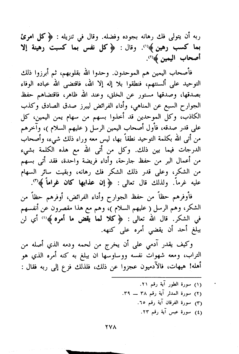 فأصحاب الْيَمين هم الموحدون وحدوا الله بقلوبهم ثمَّ أبرزوا ذَلِك التَّوْحِيد على ألسنتهم فنطقوا بِلَا إِلَه إِلَّا الله فَاقْتضى الله عباده الْوَفَاء بصدقها وصدقها مَسْتُور عَن الْخلق وَعند الله ظَاهر فاقتضاهم حفظ الْجَوَارِح السَّبع عَن المناهي وَأَدَاء الْفَرَائِض ليبرز صدق الصَّادِق وَكذب الْكَاذِب وكل الْمُوَحِّدين قد أخذُوا بِسَهْم من سِهَام يمن الْيَمين كل على قدر صدقه فَأول أَصْحَاب الْيَمين الرُّسُل عَلَيْهِم السَّلَام وَآخرهمْ من أَتَى الله بِكَلِمَة التَّوْحِيد نطقا بهَا لَيْسَ مَعَه وَرَاء ذَلِك شَيْء وَأَصْحَاب الدَّرَجَات فِيمَا بَين ذَلِك وكل من أَتَى الله مَعَ هَذِه الْكَلِمَة بِشَيْء من أَعمال الْبر من حفظ جارحة وَأَدَاء فَرِيضَة وَاحِدَة فقد أَتَى بِسَهْم من الشُّكْر وعَلى قدر ذَلِك الشُّكْر فك رهانه وَبقيت سَائِر السِّهَام عَلَيْهِ غرما وَلذَلِك قَالَ تَعَالَى {إِن عَذَابهَا كَانَ غراما}
