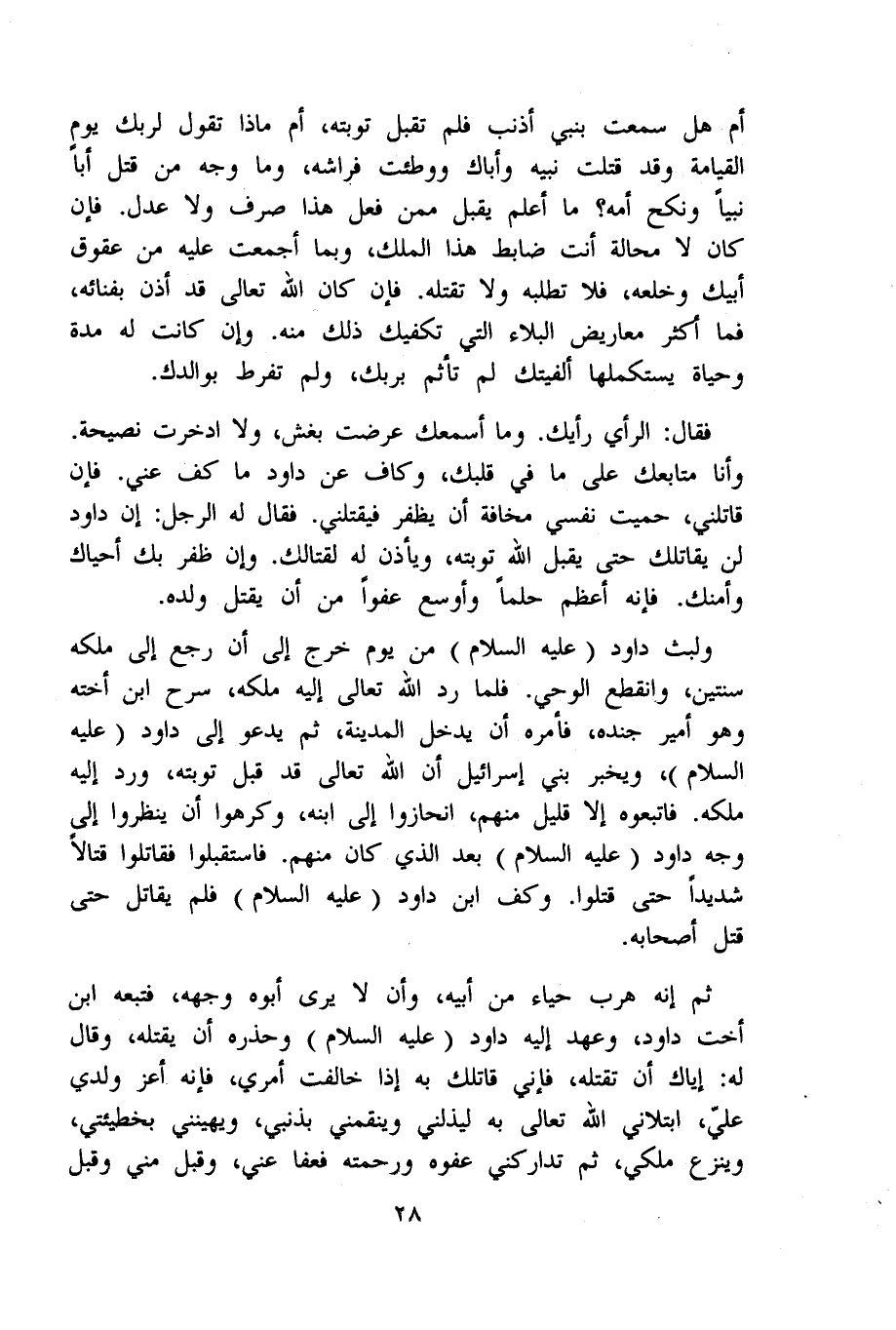 فَقَالَ الرَّأْي رَأْيك وَمَا أسمعك عرضت بغش وَلَا ادخرت نصيحة وَأَنا متابعك على مَا فِي قَلْبك وكاف عَن دَاوُد مَا كف عني فَإِن قاتلني حميت نَفسِي مَخَافَة أَن يظفر فَيَقْتُلنِي فَقَالَ لَهُ الرجل إِن دَاوُد لن يقاتلك حَتَّى يقبل الله تَوْبَته وَيَأْذَن لَهُ لِقِتَالِك وَإِن ظفر بك أحياك وأمنك فَإِنَّهُ أعظم حلما وأوسع عفوا من أَن يقتل وَلَده